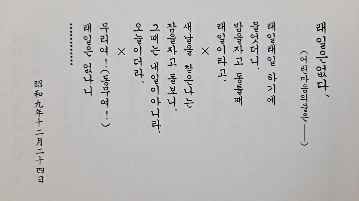내일 내일 하기에/물었더니/밤을 자고 동틀 때/내일이라고//새날을 찾던 나도/잠을 자고 돌보니,/그때는 내일이 아니라/오늘이더라//무리여!/내일은 없나니/……/ _ (1934.12.24. 윤동주 17세, 최초 작품)/3. 내일은 없다 ― 어린 마음이 물은(시)/_ 1집(나의 습작기의 시아닌시), 정음사 출판사 삼판(1976년 출판)에 실려 있음 ―『윤동주』3