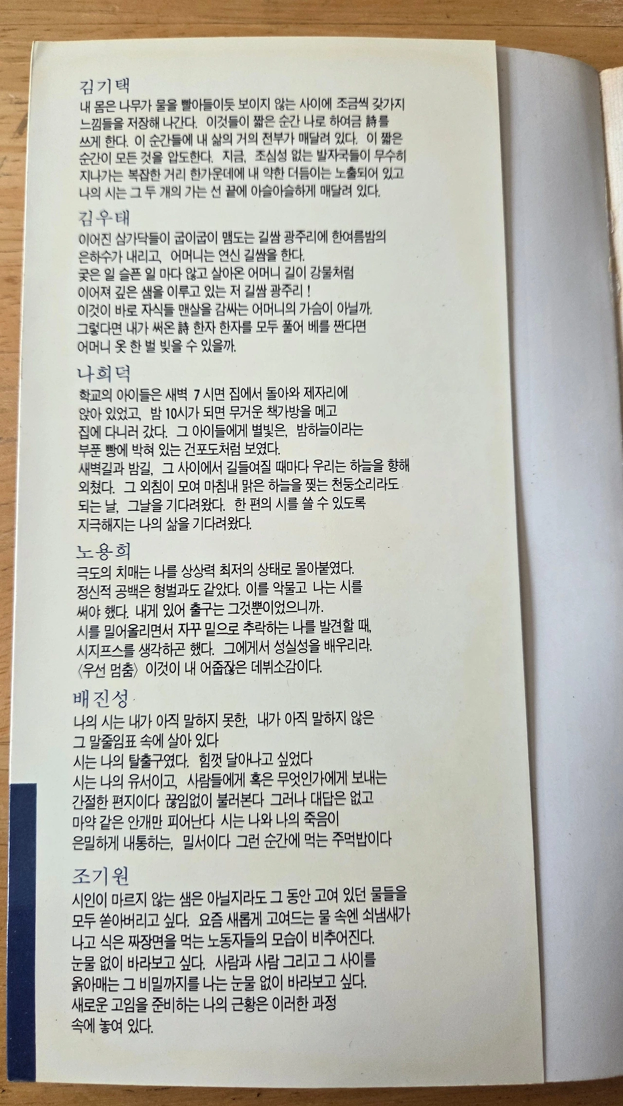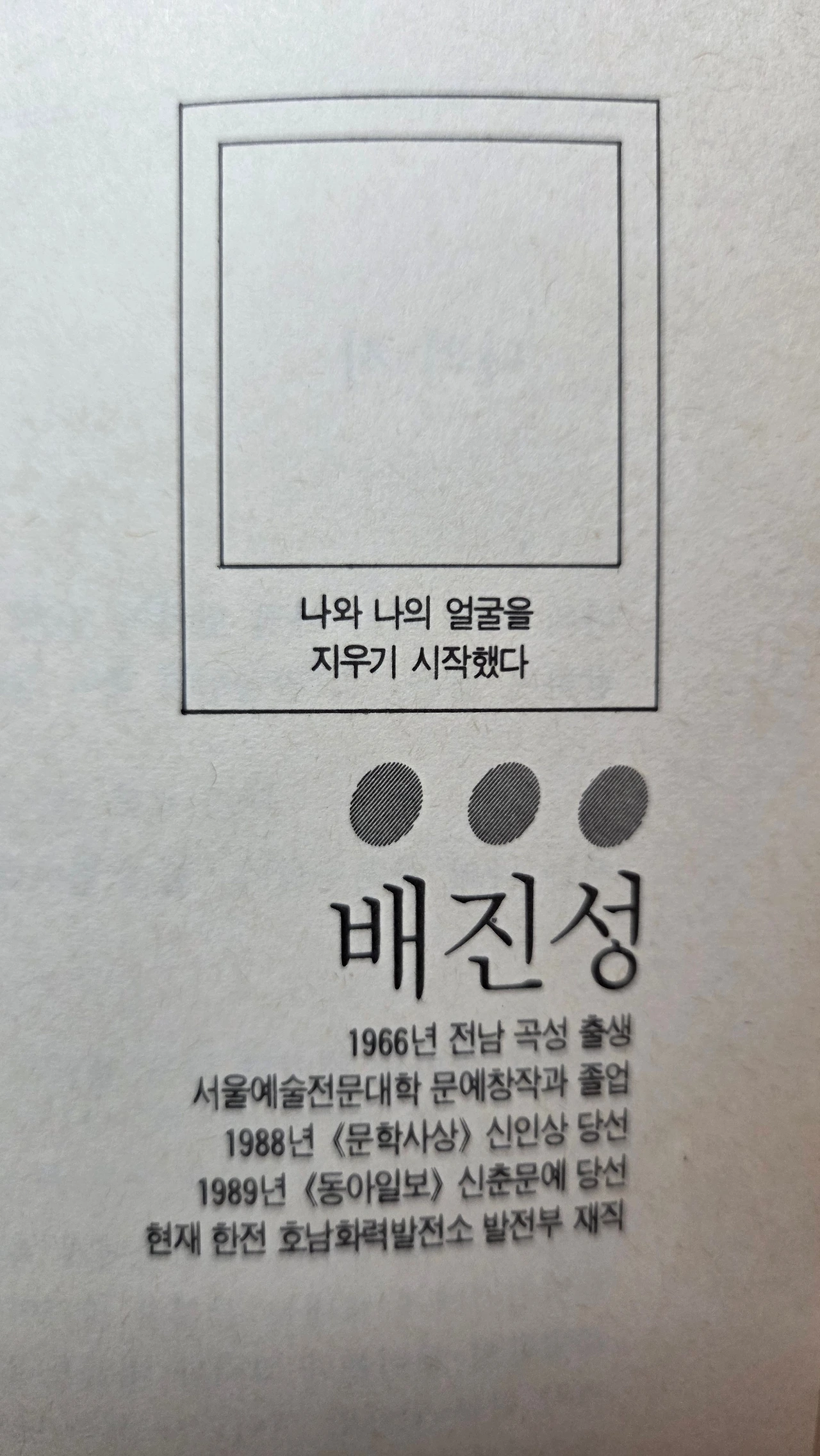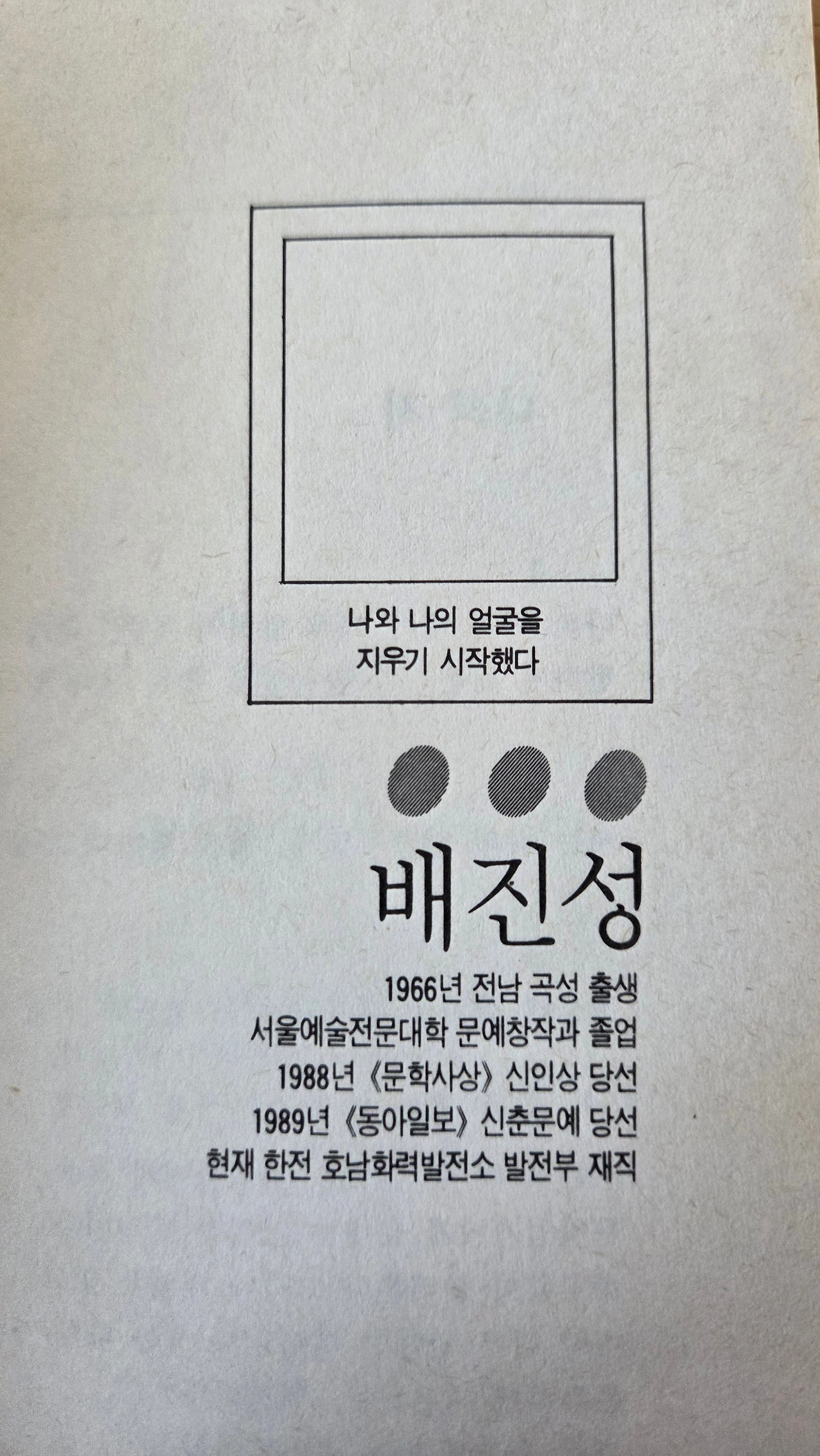 『그리하여 나는 살아있다』 이 책 제목은 나의 시「고백한다 그리하여 나는 살아있다」에서 따온 제목이었다 그런데 이 책에서 나는 이미 나와 나의 얼굴을 지우기 시작했다 나는 왜 나와 나의 얼굴을 지우기 시작했을까 나는 1988년 봄에 문학사상 신인발굴에 당선되었고 1989년 신춘문예를 통하여 막 시인으로 출발하고 있었다 그런데 그렇게 출발선상에서 나는 왜 나와 나의 얼굴을 지우기 시작했을까 서울 인사동 평화 만들기에서 만나곤 하던 그때의 시인들은 지금 어떻게 살고 있을까 김기택 시인, 김우태 시인, 나희덕 시인, 노용희 시인, 배진성 시인, 조기원 시인, 1957년생 김기택 시인과 노용희 시인, 1963년생 조기원 시인, 1964년생 김우태 시인, 1966년생 나희덕 시인과 배진성 시인, 그중에서 배진성 시인은 그때부터 꿈꾸던 자신의 소망처럼 이름과 얼굴을 잘 지우고 살았던 것 같다 그런데 다른 시인들은 지금 어디에서 어떻게 살고 있을까? 책의 표지 속에서 날아가던 새 여섯 마리는 지금 어느 하늘을 날아가고 있을까?