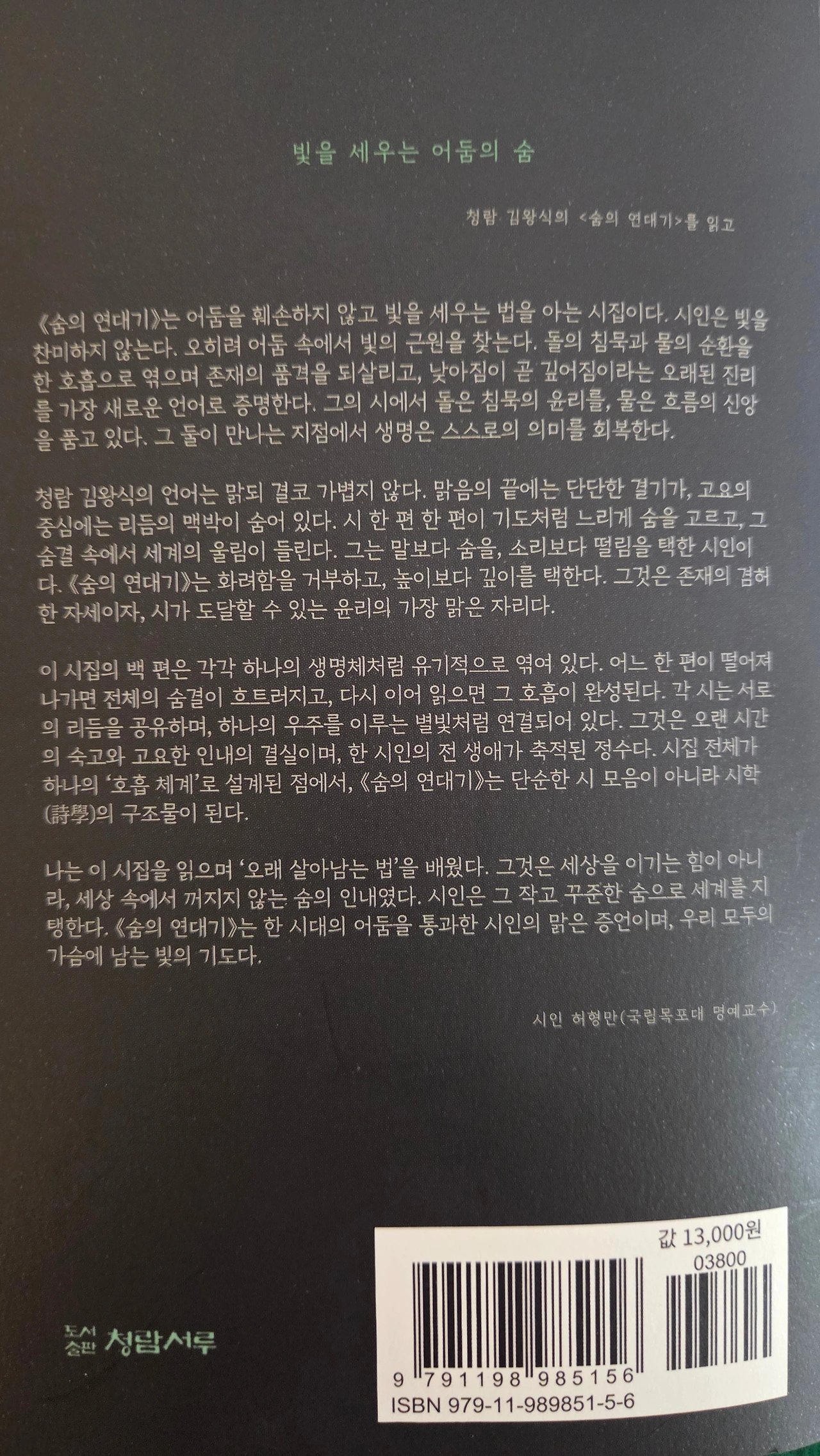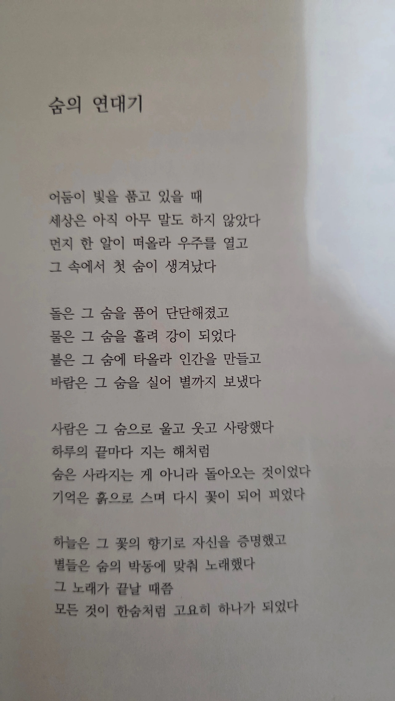 《숨의 연대기》는 눈으로 읽는 시집이 아니라, 숨으로 읽는 경전에 가깝다.