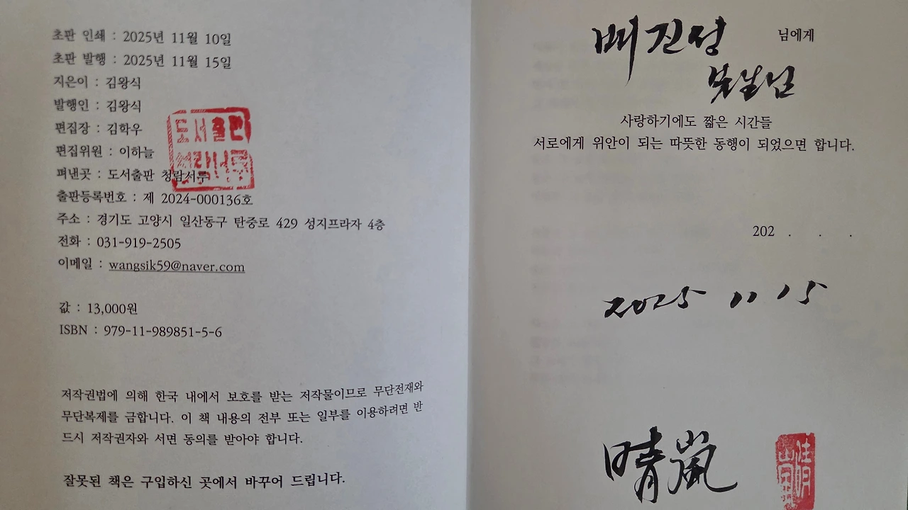 ‘청람’이라는 이름과 ‘김왕식’이라는 이름을 좋게 불러주셨지만, 그 호명 속에는 개인을 넘어 문학을 대하는 태도와 삶을 바라보는 시선이 함께 담겨 있음을 느꼈습니다. 이름이란 결국 한 사람이 걸어온 시간의 총합일 텐데, 그 시간을 따뜻하게 불러주신 배려에 감사할 따름입니다.