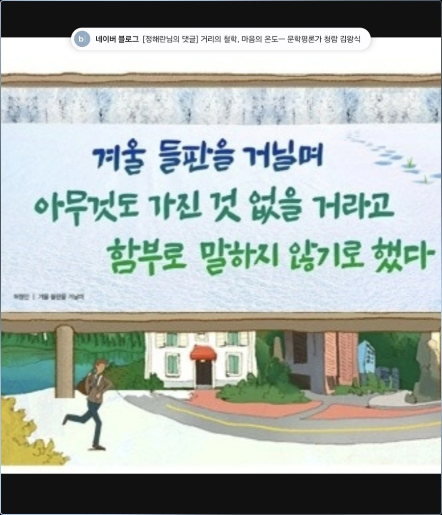 이 다섯 줄의 문장은 그의 인생 철학을 압축한다. 겉모습으로 타인을 판단하지 말고, 한 사람의 내면에 잠든 생명력을 믿으라는 메시지다. 겨울 들판을 바라보며 인간의 존엄을 떠올리는 그의 시선은, 시인이자 성찰자로서의 깊은 도덕적 감수성을 보여준다. ‘함부로 말하지 않기로 했다’는 다짐은 단순한 윤리적 명제가 아니라, 삶의 태도에 대한 선언이다.