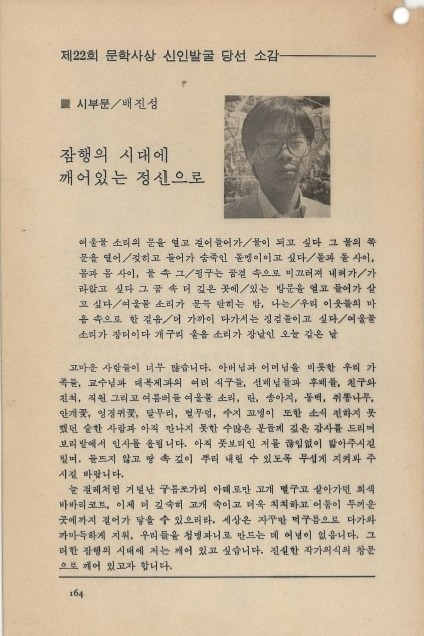 들판에서는 늘 보리타작하는 소리가 들린다/정미소 주인이셨던 아버지가/벨트에 물려 끌려가던 날부터 축이 헛도는/천장에서 다시 떨어지듯 우리 식구들은/빈 들판으로 내쫓겼다 발동기 같은 큰 형은/발동기를 뜯어 짊어지고 논둑길을 넘어 다녔다/타맥기도 부서진 아버지 갈비뼈처럼 풀어/옮겨 맞추곤 했다 경운기들이/손쉽게 해치우고 들어가 쉬는 동안에도 우리는/들판에서 밤늦도록 이슬에 젖어야 했다/카바이드 불빛 아래서 카바이드를 녹이는 물처럼/우리 식구들의 가슴은 애타게 들끓었다/불이 꺼진 뒤에도/카바이드 깡통 속에는 몸살 나게 아름다운/사랑이 숨 쉬고 있었다 비 오는 날이면/보리 한 됫박 퍼내어 바꿔온 복숭아를/보리 창고에서 나눠먹곤 했다 큰 형 몸에서는/늘 기름 냄새가 났고 바뀐 논에 말뚝을 박을 때마다/우리들의 들판이 한꺼번에 흔들렸다 함부로/골병들어 거덜 난 보릿대를 곁에 쌓는 작은 형/보리 무덤에 검불을 쓸어내는 누이는/갈퀴와 고무래처럼 한없이 슬픔을 후볐다/가마니 한 장 크기의 그늘 속에서 조용히/기어 다니다 잠들곤 하던 나는 자연 숙제로 기르던/거꾸로 매달린 형의 무/그 속에서 싹트는 콩 거꾸로/자라던 허약한 순만 바라보며 그렇게 자랐다/그리고 많은 날들 다음으로 오는 오늘/털털털 탈탈탈 털털털털털 탈탈탈탈탈/들판을 온통 뒤집어엎어버리던 경운기가/골목마다 들쑤신다/추곡수매 공판날 줄서가는 아침/하곡수매처럼 저 멀리 노인들이 손수레 밀고/끌고 오신다 빈 들판에 바람이 껍질을 벗고/지나간다 그 길가로 바람의 껍질이 차갑게 쌓여/있다 월경리 사람들의 깊은 사랑을 실어 나르는/경운기는 힘센 들짐승이다 그러한 아침/나는 다른 계절 속으로 떠나 눈길에 경운기/발자국을 만들며 고향으로 가는 길을 걸어서 간다// (1988년 제22회 《문학사상》 신인발굴 시 부문 당선작 「경운기」) ―『배진성』3