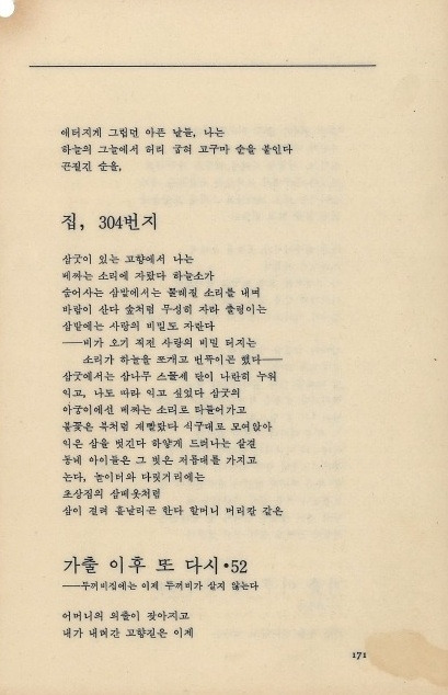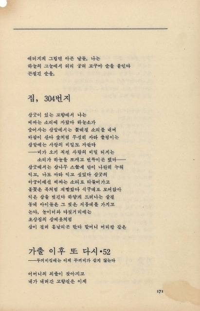 깊은 숲 속에 조촐한 집을 짓는다 옹달샘 곁에 옹달샘 집을 짓는다 무덤 같은 집을 짓는다 이어도에 나의 집을 짓는다