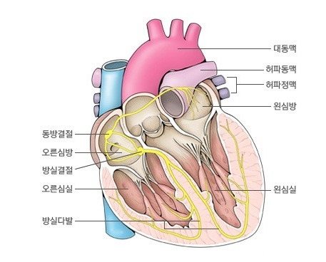 그렇게 웅덩이처럼 깊이 파는 과정에서 중요한 신경까지 손실되고 말았다. 우리 사람들의 심장은 그냥 알아서 뛰는 것이 아니라 전기자극을 통해서 율동 운동을 하게 된다. 우심방 위쪽에 동방결절이란 부분이 있다. 바로 그 동방결절에서 전기적 신호가 규칙적으로 발생한다. 교감신경과 부교감신경 등 여러 가지 요인에 의하여 전기적 신호가 발생하게 된다. 따라서 우리들의 몸은 여러 가지 조건들 때문에 전기적 신호가 빈번하게 발생할 수도 있고 느리게 발행할 수도 있다. 그 발생 횟수에 따라서 우리들의 심장을 빨리 뛰게 하거나 느리게 뛰게 되는 것이다. 동방결절에서 발생한 전기적 신호는 심장 양쪽으로 신호를 보내서 심방과 심실을 수축하거나 이완해서 펌프 역할을 할 수 있게 만드는 것이다. 그러니까 전선 같은 신경이 왼쪽과 오른쪽으로 각각 연결되어서 전기적 신호를 보내주는 것이다. 그렇게 좌심방 좌심실은 거의 동시에 수축하고 우심방 우심실 또한 거의 동시에 이완되어서 우리 귀에는 쿵닥 쿵닥 두 박자 소리가 들리는 것이다. 사실은 네 박자로 들려야 하는데 심방의 소리는 적게 들리고 상대적으로 심실의 소리는 크게 들려서 심실에서 들리는 소리만을 느끼는 경우가 많다. 하지만 조용한 시간에 좀 더 자세히 들어보면 네 박자의 심장소리가 들린다. 쿵닥 쿵닥이 아니라 궁쿵궁쿵 궁쿵궁쿵 이렇게 들릴 것이다.