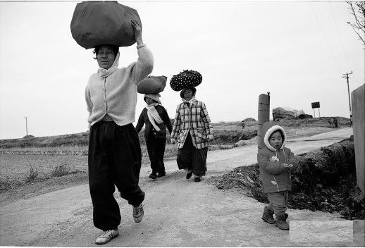 지구에 도착하여 보니 어느 작은 시골이었다. 그믐달도 없는 깜깜한 밤에 보름달을 이고 가는 도붓장수 여인이 있었다. 커다란 미원박스 안에 바늘, 실, 양말, 동정, 고무줄, 비누… 많은 생활용품들이 담겨있고 그 박스 아래는 생활용품과 물물교환 한 쌀, 보리, 조, 수수, 콩 등이 담긴 자루가 있고 또한, 그 박스 위에도 비교적 가벼운 물건들과 함께 이미 팔려나간 물건들 대신 수숫대 빗자루며 계란 등과 함께 손때 묻은 되가 있었다. 이 모든 물건들을 아주 큰 보자기에 싸서 이고 가는 여인이 있었다. 집을 나설 때에는 빈 헝겊 자루들이 똬리 역할을 했지만, 그 접혀 있었던 자루들이 불룩하게 다 채워지고 네모난 박스 위에도 묘지처럼 볼록해서 보름달이 되어야만 집으로 돌아가는 여인 이었다.