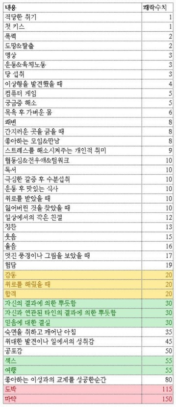 어제 어디선가 득템한 쾌락지수 차트입니다.