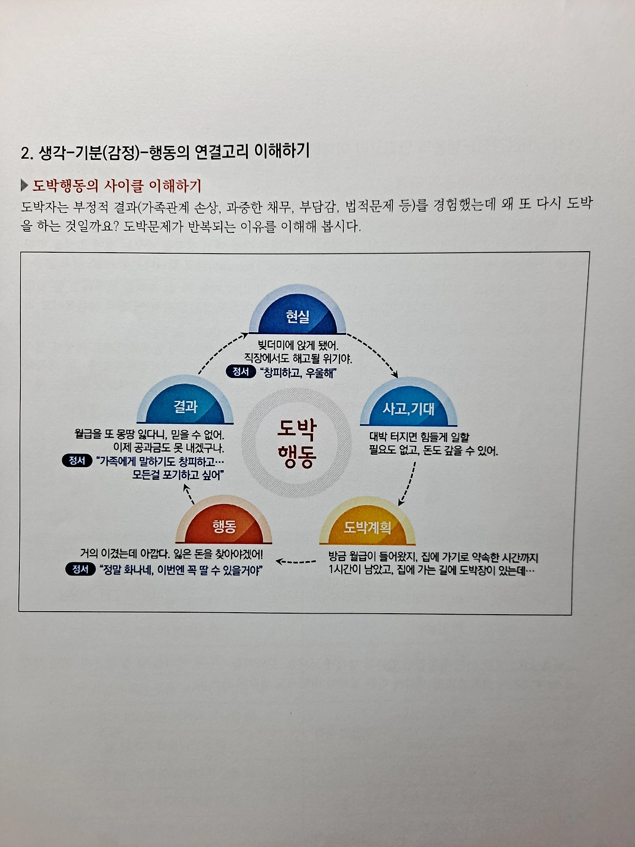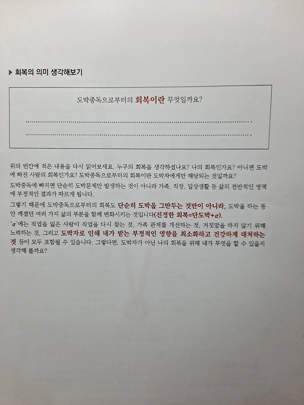 도박중독자는 도박을 하는 것이 자연스러운 일일까요? 안 하는 것이 자연스러운 것일까요? 도박중독자는 도박을 하는 것이 정상일까요? 도박을 안 하는 것이 정상일까요? 도박을 하는 것이 자연스럽고 정상입니다. 도박중독자 입장에서 그렇다는 것입니다. 우리는 당연히 안 하는 게 정상이고 자연스럽다고 생각할지 몰라도, 현재 도박에 빠진 사람은 도박을 하는 것이 자연스러운 행동입니다. 거기서부터 출발해야 빚 문제를 잘 다룰 수 있습니다.