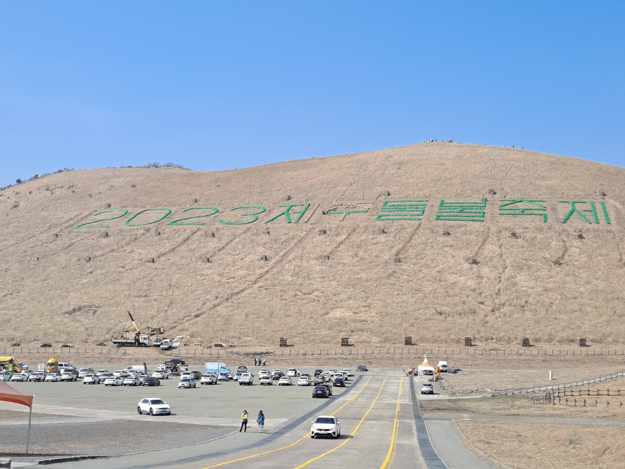 오늘 오후에 새별오름에 들러서 살펴보니 행사준비가 거의 마무리단계에 이르러 있었다. 오름 이마 부분에 해마다 약간씩 다른 글씨를 만드는데 올해는 '2023제주들불축제'라는 글씨를 만들고 있었다. 미리 베어서 사각모양으로 만들어진 억새 묶음으로 크게 글씨를 만들고 다량의 화약까지 장착해서 화려한 불꽃쇼를 보여주곤 한다. 또한 중간중간에 달집도 수십 개 만드는데 위에까지 모노레일을 설치해서 한다. 그런데 이제 작업이 거의 완료되어 모노레일 철길도 철거하여 트럭에 싣고 있었다.
