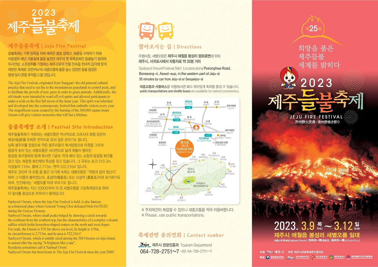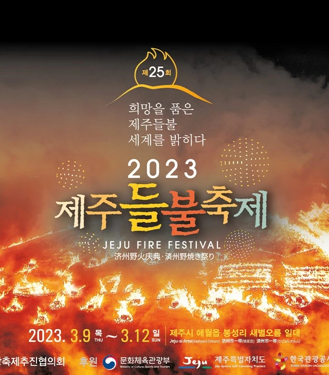 이 축제의 가장 하이라이트는 여러 개의 달집과 함께 오름 한쪽 면을 모두 태우는 오름 태우기라고 할 수 있을 것이다. 제주의 오름을 태우는 들불축제가 올해는 3월 9일부터 3월 12일까지로 결정되었다. 제주시 애월읍 새별오름 일대에서 열린다. 제주시는 오는 9일 제주시청 광장에서 개막식을 시작으로 10~12일 새별오름에서 ‘제주들불축제’를 연다고 2일 밝혔다. 이번 들불축제는 2019년 이후 4년 만에 대면축제로 열린다. 올해 들불축제는 ‘희망을 품은 제주 들불, 세계를 밝히다’라는 주제로 9일 제주시 삼성혈에서 들불 불씨 채화 제례를 시작으로 시청광장에서 들불 불씨 모심행사, 들불 콘서트, 소원지 쓰기 및 달기 등의 행사를 연다. 이어 10일에는 새별오름 일대에서 읍·면·동 줄다리기와 집줄놓기, 소원달집 만들기 등 전통문화 경연과 제주도내 문화예술인들이 참여하는 버스킹 공연, 풍요와 발전을 기원하는 희망기원제가 열린다. 또 들불 불씨 점화 및 횃불 대행진, 달집 태우기 행사가 이어진다. 마상마예공연장에서는 마상마예 공연과 제주도 무형문화재인 제주농요 공연이 있다. 11일에는 들불축제의 하이라이트인 오름 불 놓기가 펼쳐진다. 처음으로 드론을 이용해 불을 붙이게 된다. 마지막 날에는 묘목 나눠주기, 농수축산물 할인행사, 도민 노래자랑 등이 있다. 축제기간에는 축제 역사관, 재활용품 나눔 장터, 지역농특산물 홍보·판매관, 향토음식점, 푸드트럭 등을 운영한다. 시는 축제를 찾는 관람객들을 위해 축제 기간 제주시 종합경기장과 서귀포시 제2청사 주차장을 거점 주차장으로 지정해 셔틀버스를 운행할 예정이다. 들불축제는 제주도내 중산간 목장지대에 진드기 등을 없애기 위해 묵은 풀을 태우는 목축문화를 축제화한 것으로, 문화체육관광부의 문화관광축제로 지정됐다.