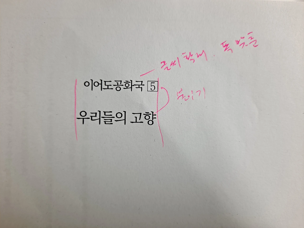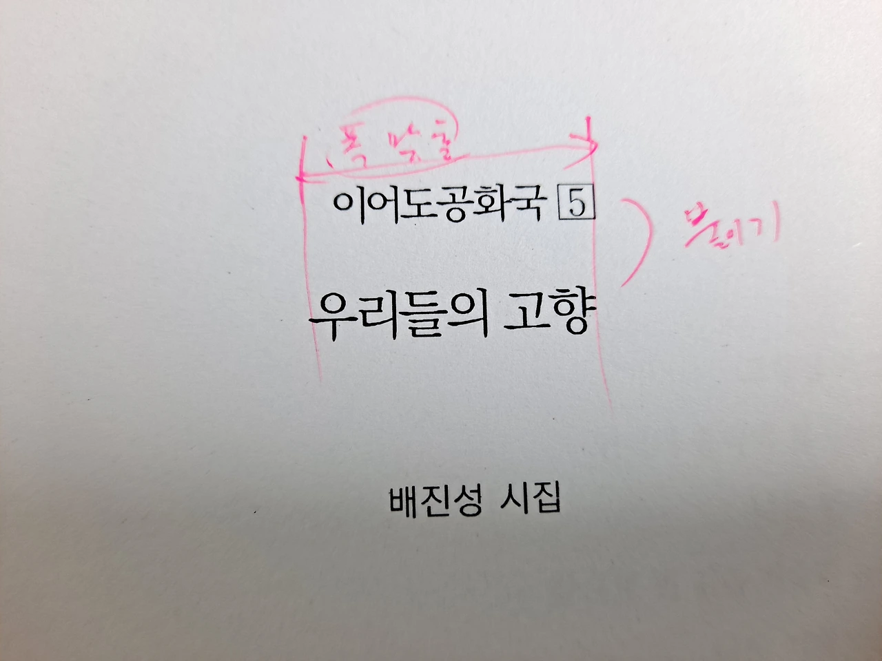 7쪽과 9쪽 <이어도공화국 5> 글씨 확대나 자간거리조정으로 <우리들의 고향>과 폭 맞추면 좋겠습니다. 또한 비어있는 행을 삭제하여 한 제목처럼 붙여주시면 좋겠습니다.