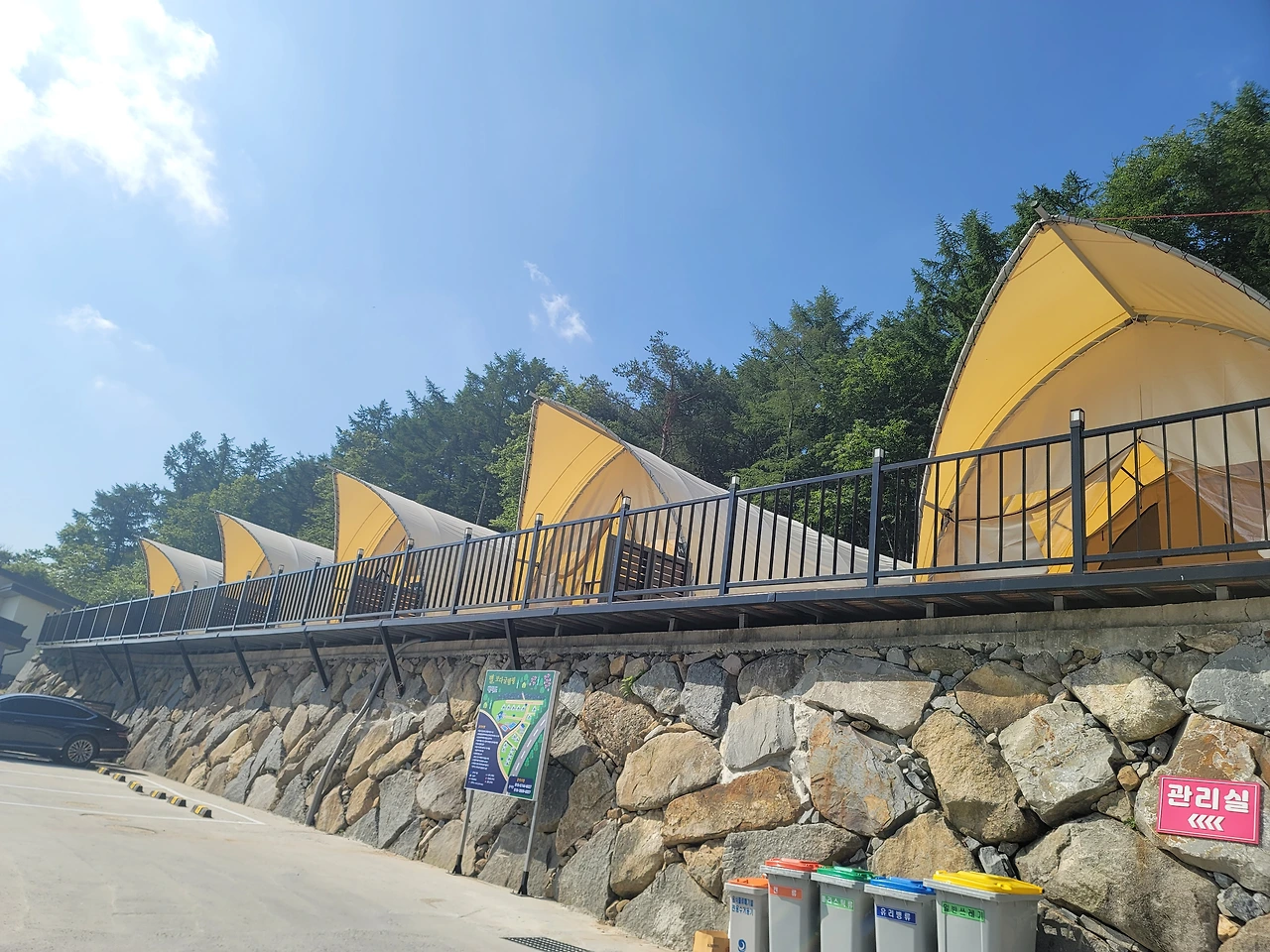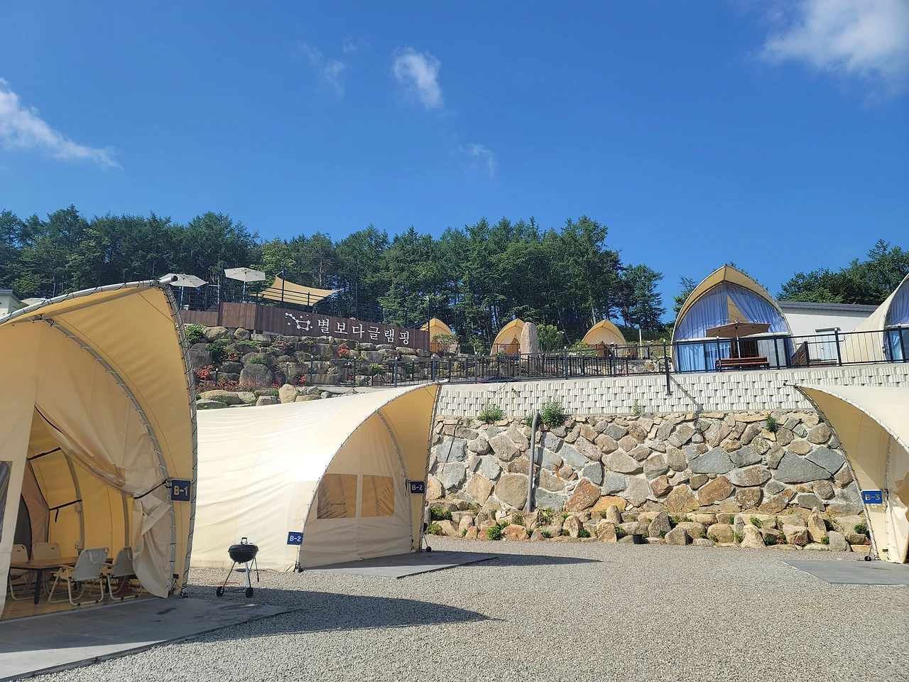 지난밤의 밤공기 느낌과, 하늘, 별, 개구리울음소리, 심지어 아침에 우는 소 울음소리마저 나는 사랑스럽다 느꼈다. 남편은 소 울음소리 때문에 잠을 설쳤다고 하는데 나는 크게 거슬리지 않았고 오히려 글램핑 텐트 안의 포근한 느낌이 참 좋았다. 지금도 그날 아침에 눈 떠서 보는 환하고 온화한 빛들이 세상 따뜻한 기억으로 남는다.