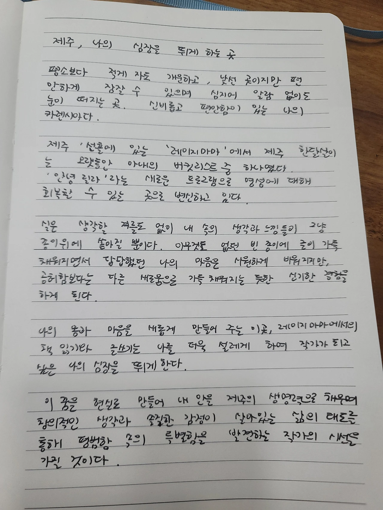 특히 요즘 강렬하게 올라오는 제주 살이에 대한 마음을 바라보며 책을 읽고 영감을 얻기 위해 필사도 해본다. 내 상황에서 어떻게 하면 나는 제주에서의 경험을 더 할 수 있을까? 가족 여행 혹은 혼자 여행으로 잠시 다녀온 제주 여행이 못내 아쉽다. 가면 늘 제주는 나를 채워주고 힘을 북돋워 준다.