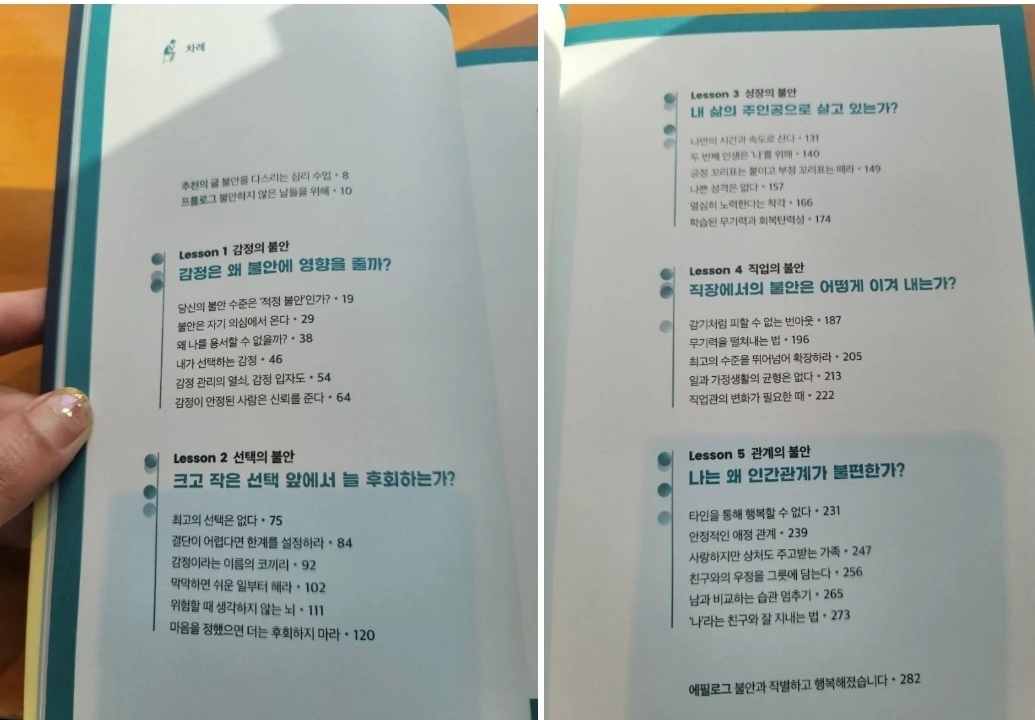 먼저 순서대로 책을 훑어보다가 더 끌리는 내용을 먼저 집중해서 읽는다. 전반적으로 어렵지 않게 나의 삶의 문제들과 연결하며 글을 읽을 수 있다. 누구나 겪는 심리적 불안과 그로 인해 생활의 어려움, 마음고생등을 심리학적 관점과 이론으로 알기 쉽게 설명해 주고 있어 좋았다.