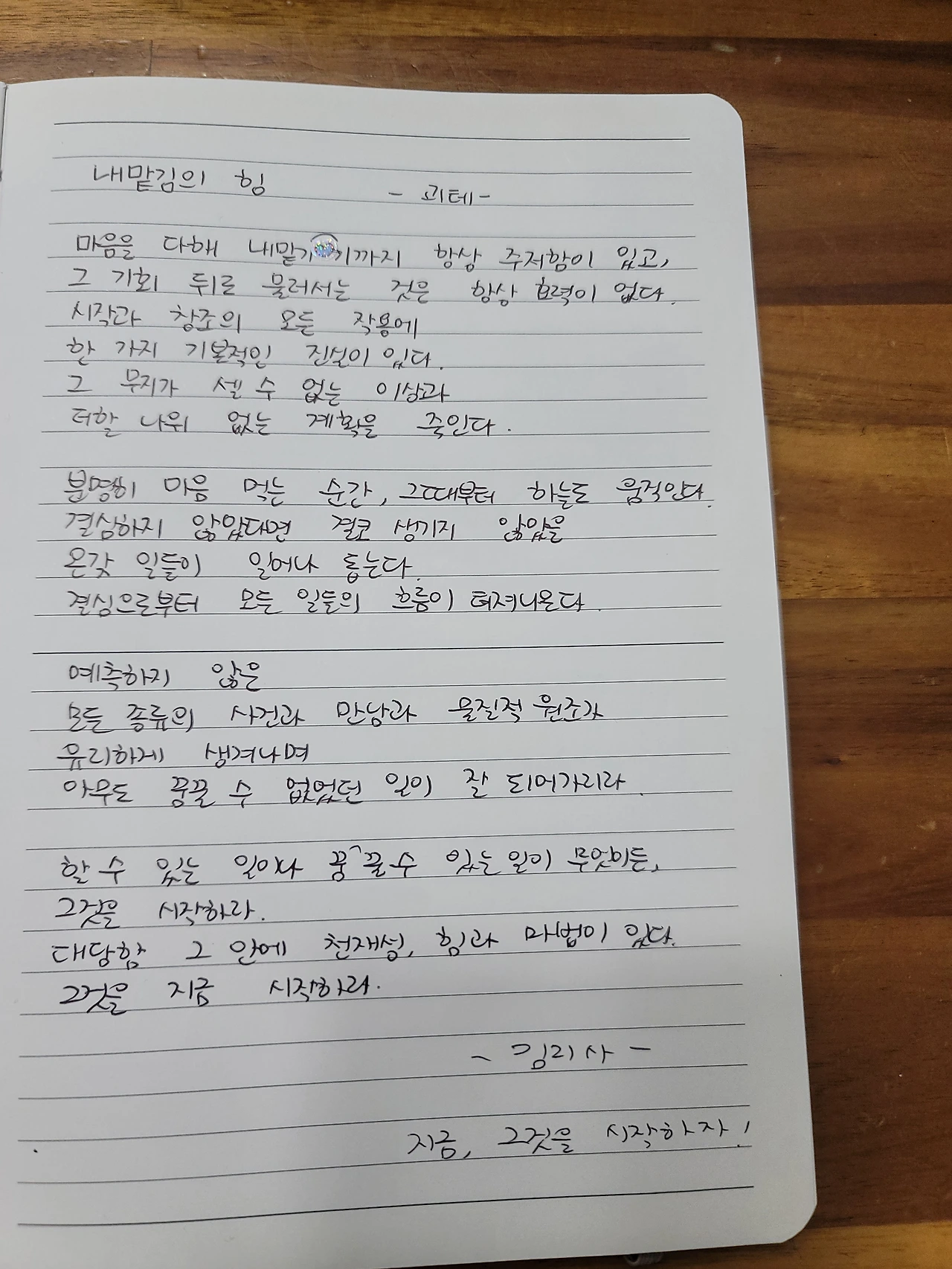 책을 읽고 글을 쓰고 필사를 하고, 확언을 하고 늘 나를 만들어 갔는데 책을 좀 내려 두어도, 확언을 쓰지 않아도 여기 이 모든 것을 의식하는 나는 늘 나와 함께 였다. 그런데 신기한 것은 또 하고 싶어진다는 것이다. 억지로가 아닌 하고 싶어서.