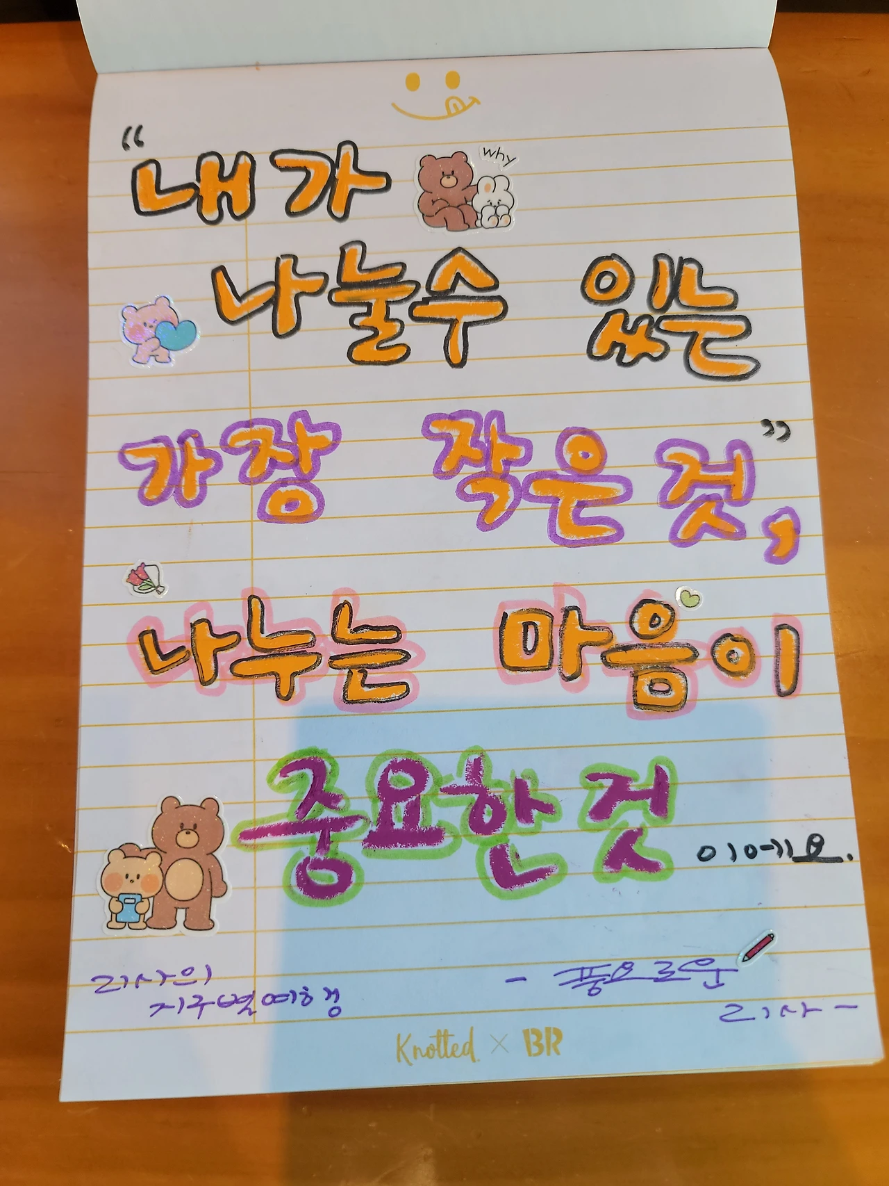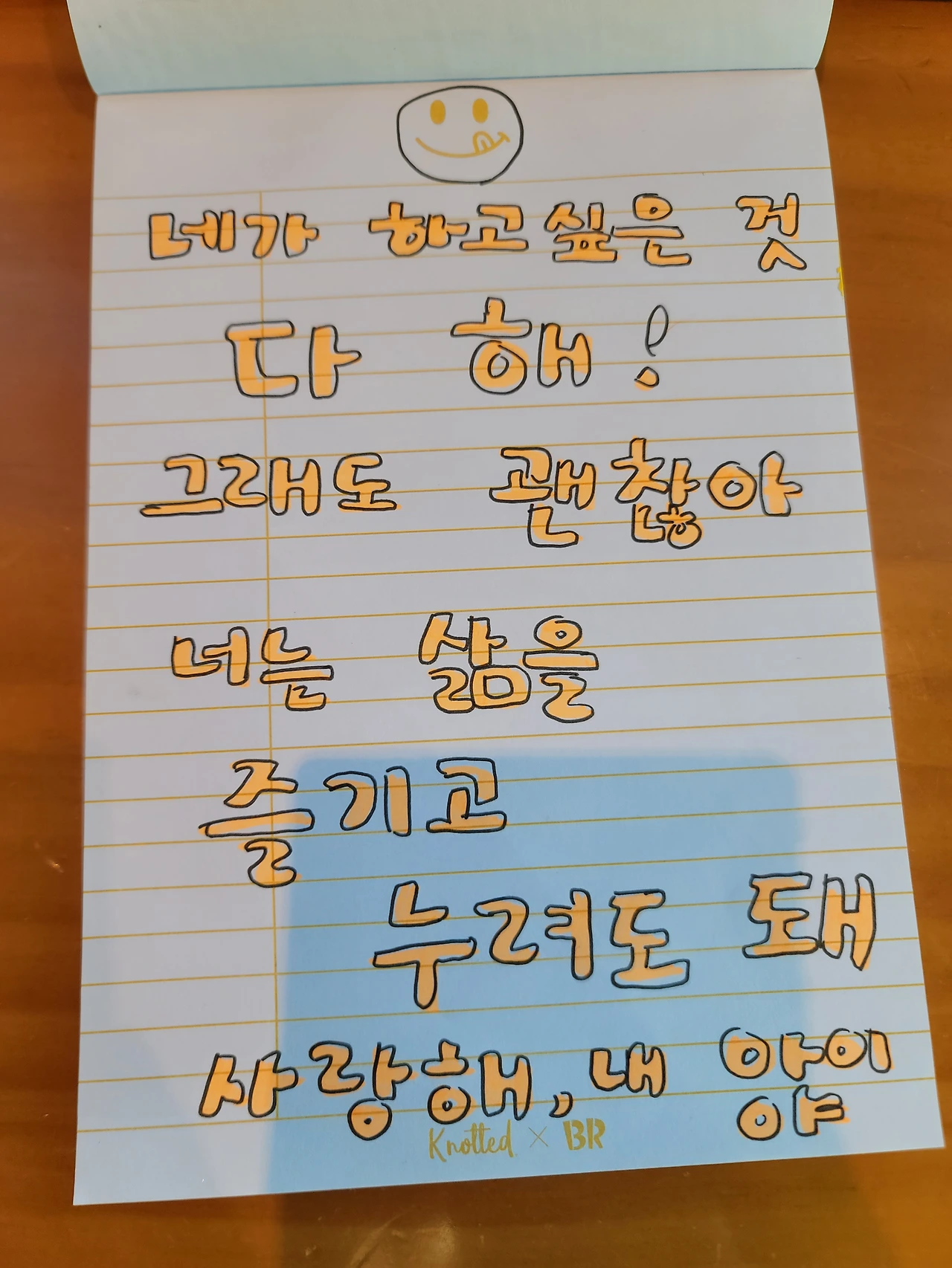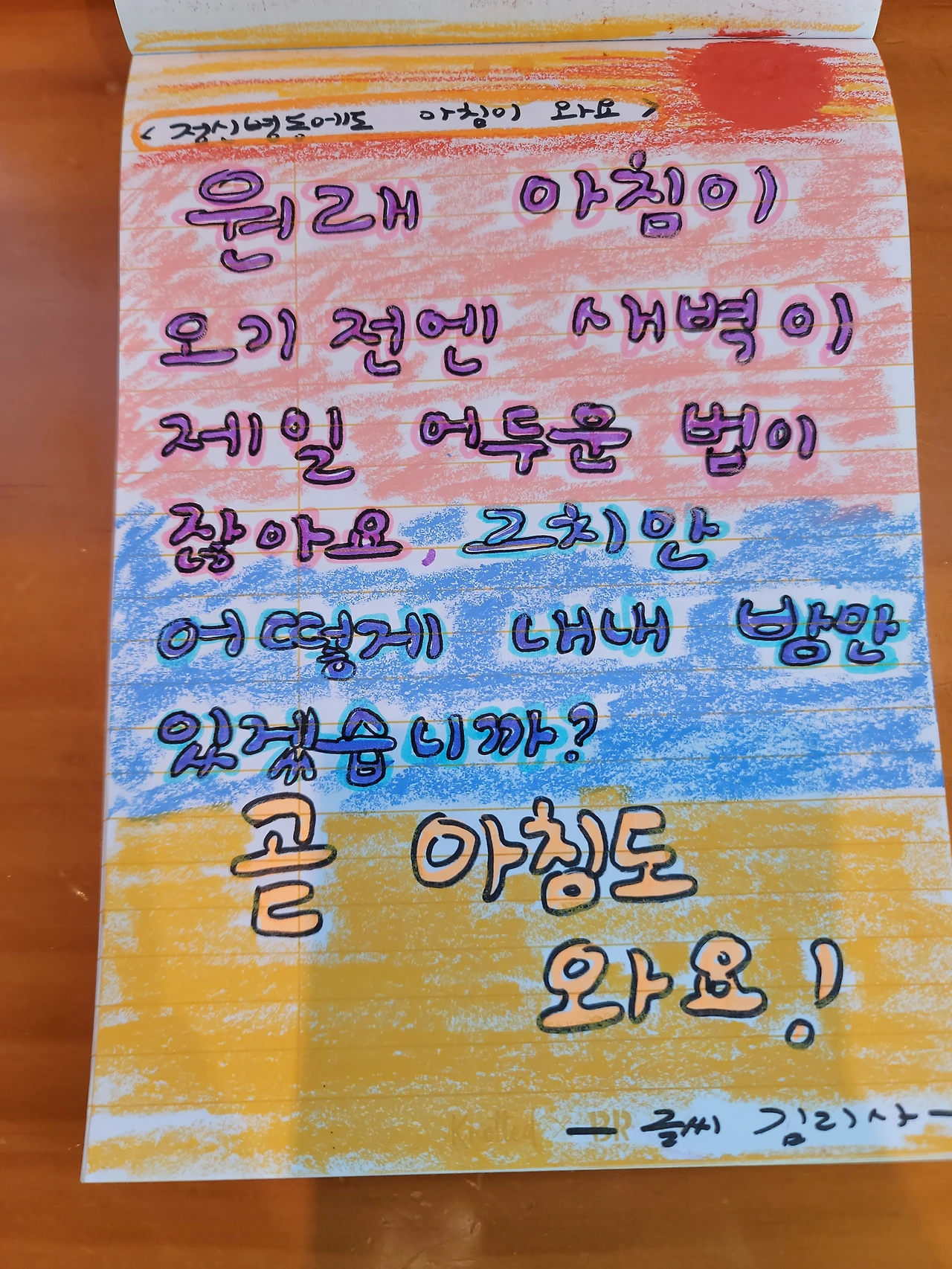 최근에는 좀 유치하지만 어릴 적 느끼던 크레파스 질감이 좋아서 오일파스텔을 자주 사용하고 있다. 볼펜으로 쓰는 작은 글씨가 아니라 큼직하게 쓰니 속이 후련한 느낌이다. 뭔가 내 안에 갇혀 있던 욕구가 툭 튀어나와 시원하게 가려운 곳을 긁어 주고 간다. 아, 너는 이런 말을 자고 듣고 싶었구나. 아, 너는 이런 말을 눈치 보지 않으며 막 외쳐대고 싶었던 거구나. 나는 어느 때 보다 활발하게 색색의 펜과 오일파스텔, 형광펜 등으로 나의 묵은 감정과 소통한다.
