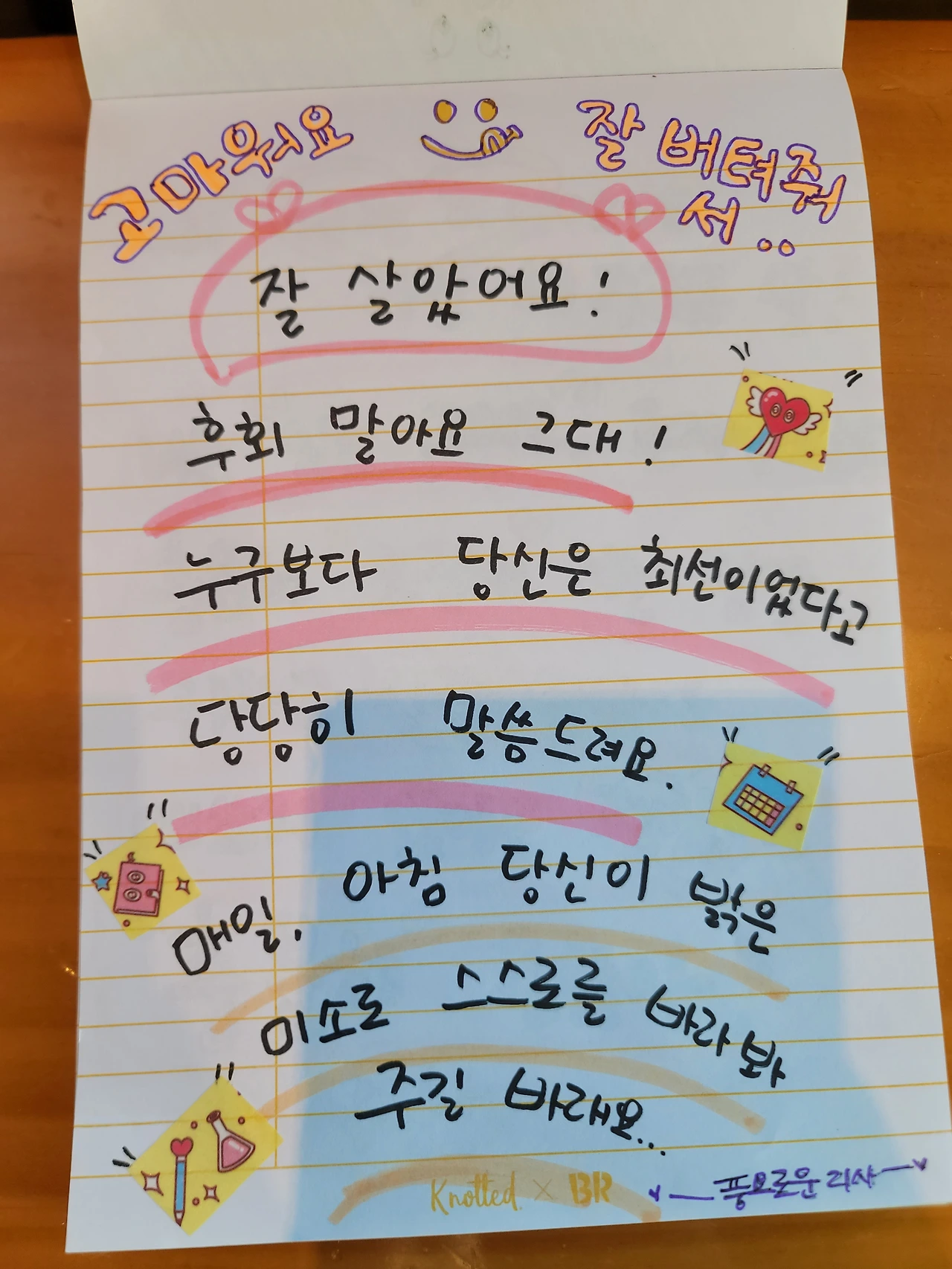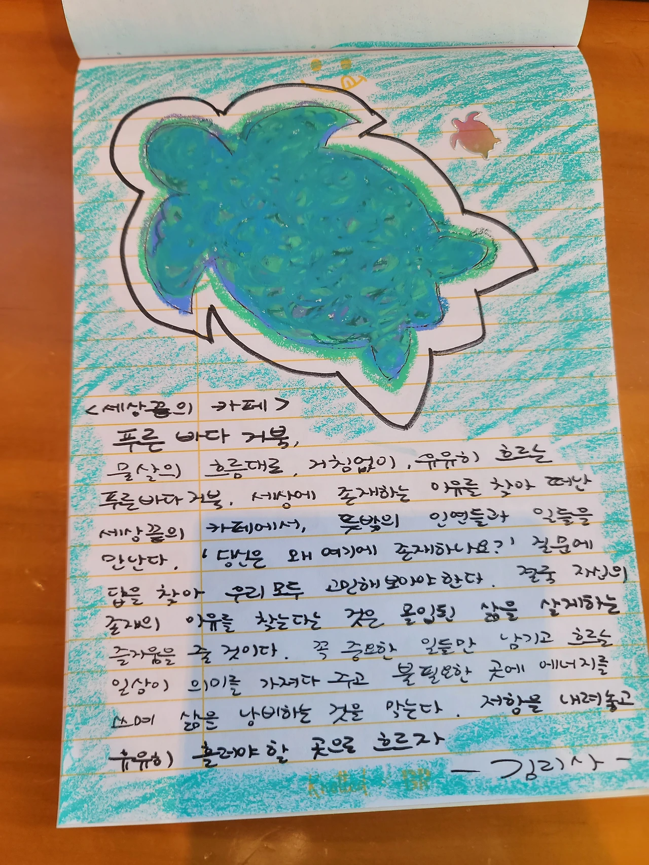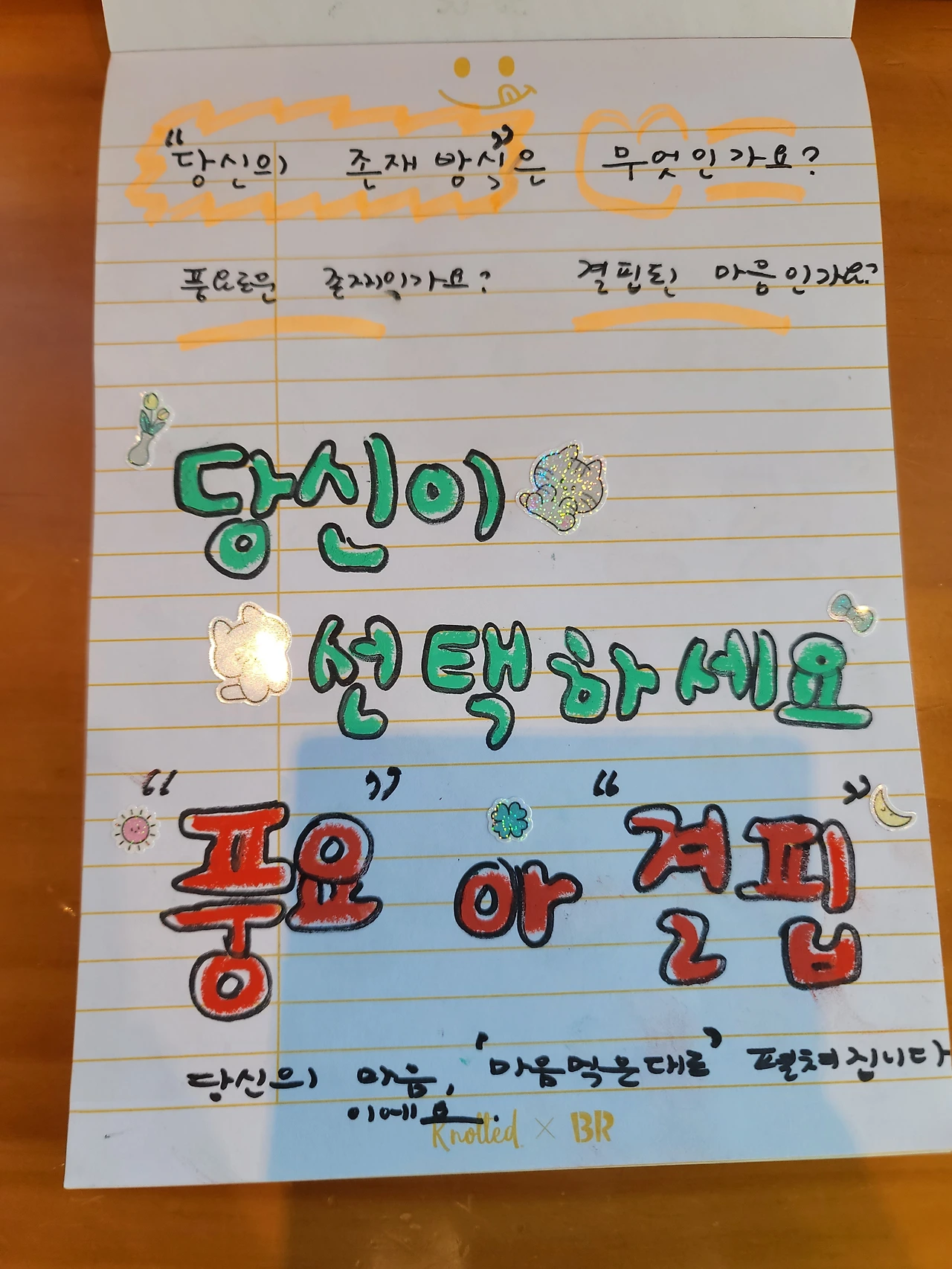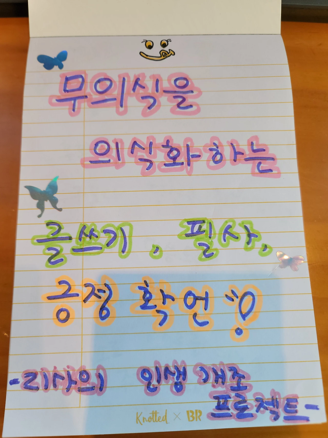 최근에는 좀 유치하지만 어릴 적 느끼던 크레파스 질감이 좋아서 오일파스텔을 자주 사용하고 있다. 볼펜으로 쓰는 작은 글씨가 아니라 큼직하게 쓰니 속이 후련한 느낌이다. 뭔가 내 안에 갇혀 있던 욕구가 툭 튀어나와 시원하게 가려운 곳을 긁어 주고 간다. 아, 너는 이런 말을 자고 듣고 싶었구나. 아, 너는 이런 말을 눈치 보지 않으며 막 외쳐대고 싶었던 거구나. 나는 어느 때 보다 활발하게 색색의 펜과 오일파스텔, 형광펜 등으로 나의 묵은 감정과 소통한다.