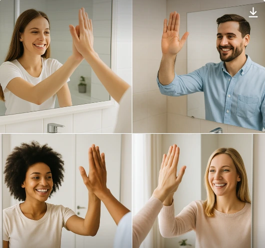 "아침에 거울을 보며 하이파이브 하기"는 아주 간단한 행동이지만, 심리적으로 꽤 강력한 효과가 있다는 연구와 경험담이 많습니다.