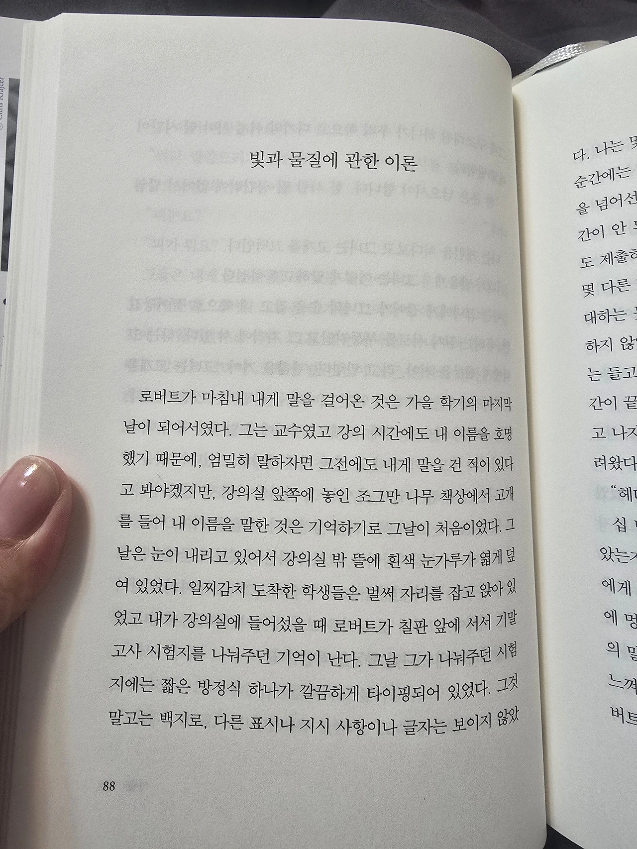 이 소설은 명확히 사건들을 판단하고 분별하는 시선을 보여 주지 않는다. 다만 우리 인생에 존재하는 수많은 '설명할 수 없는 이론'들을 가만히 응시하게 만든다. 빛이 물질을 투과하듯, 어떤 기억은 세월을 뚫고 들어와 현재의 우리를 비춘다.