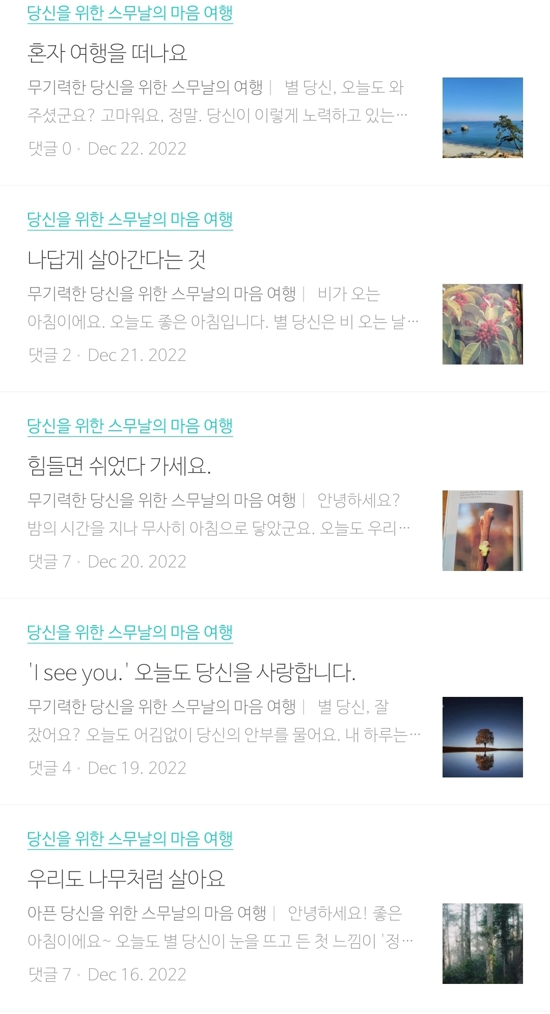 힘겨운 시간을 보낸 우리에게 주고 싶었던 따스한 아침의 응원이 담긴 글을 썼다. 스무날의 마음 여행을 떠나면서, 가장 먼저 내가 나를 응원하는 시간을 선물 받은 것 같다. 아침이 참 힘들고 고통스러웠던 시간을 기억한다. 그 시간을 어떻게든 따뜻하게 밝혀 주고 싶었던 내 마음이 가득 담긴 글이라 더 소중하다. 영화 '컨택트'처럼 시간이라는 것이 과거, 현재, 미래가 없이 한 곳에 존재한다면, 이 스무날의 마음 여행은 나의 과거, 아침부터 눈물바람을 하며 사라지고 싶은 목소리에 고통스러웠던 과거의 '나'에게 가장 먼저 줄 글이 될 것 같다.