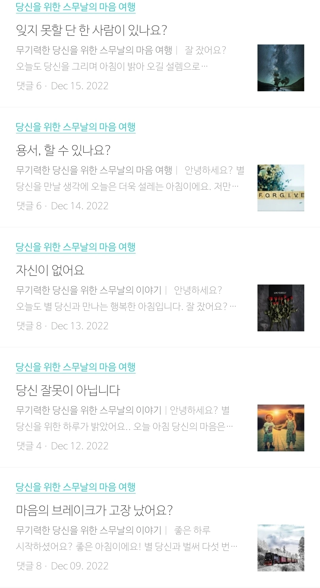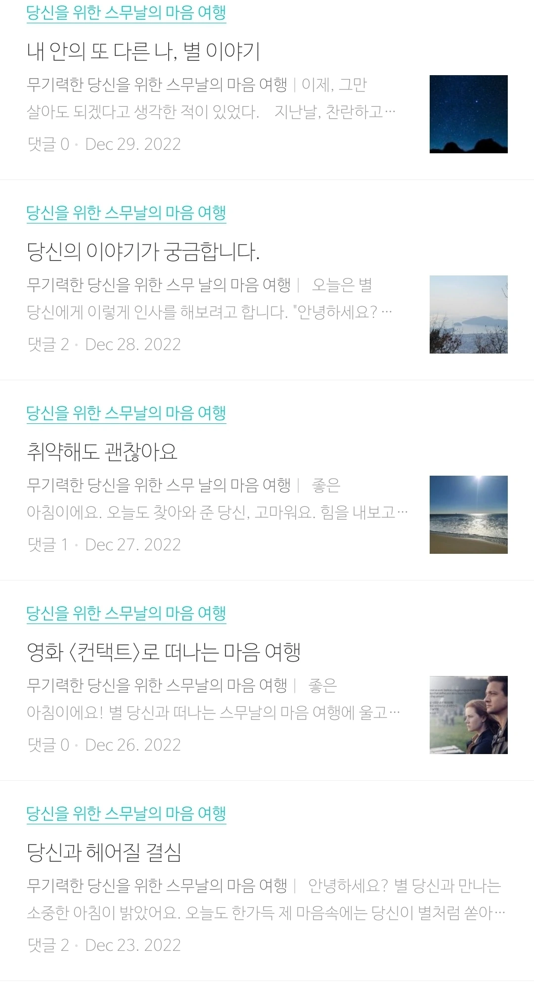 그리고, 다시 시작. 이제 다시 시작이다. 새해가 이미 내 안에 들어와 빛나고 있다. 그 언제나 책과 글이 나와 함께 하고 있으며 그 속에는 다시 사람이 있다. 사람이 함께 하며 사랑하고 사랑받는 새해를 꿈꾼다. 모든 사람들이 이렇게 행복했으면 좋겠다. 자기 안의 별을 발견하고, 느끼며, 외롭지 않았으면 좋겠다. 별의 에너지가 차고 넘친다면 자기도 모르게 별빛을 나누는 사람이 되어 있을 것이다. 우리 작가님들처럼 말이다. 나는 아직 채워가야 할 별빛이 많아 나눔에는 부족한 사람이었던 것 같다. 그런 나 또한 사랑한다. 내게 시간을 주는 것도 내가 글을 통해 배운 자기 발견이다.