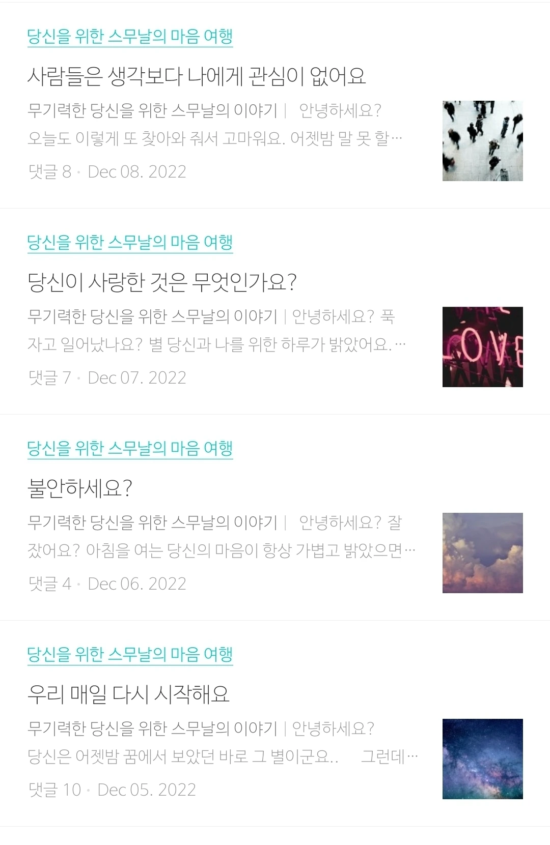 누군가에겐 별것 아닐지 모르는 이 도전이, 내게는 새해를 시작하기 전 12월을 뜨겁게 보내며 새로운 열정을 불러일으키는 힘이 되었다. '나도 하면 할 수 있구나, 꾸준하게 뭘 해 보니 새롭게 또 뭔가 할 수 있을 것 같아.' 이런 자기 긍정이 차오른다. 내가 나를 신뢰하지 못해서 늘 불만이었던 나로서는 이번 글루틴 한 달 글쓰기 프로젝트는 정말 큰 힘이다.