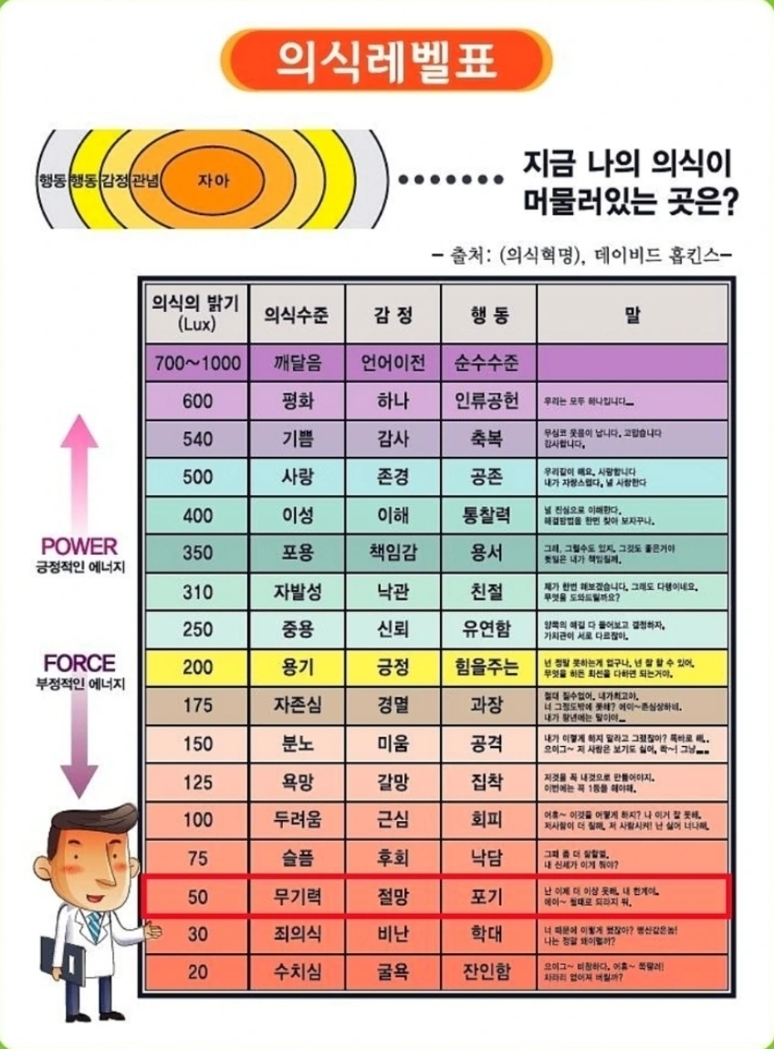 아래의 그림의 의식 레벨 표를 참고하시면 좋겠다. 굴욕, 비난, 절망, 후회, 근심, 미움 등의 하위 레벨의 의식에 있으면 삶은 낮은 차원에서 진동하며 불행을 느낀다. 감사, 존경, 이해, 사랑과 같은 감정들을 많이 쓸수록 의식이 밝고 깨어 있는 삶이다. 의식적으로 감사하기를 노력하면 이렇게 밝은 마음으로 살아갈 수 있고 자기 자신을 더욱 긍정하게 된다. 존재가 가질 수 있는 가장 밝은 감정은 존재함 자체를 감사하는 것이 아닐까 하는 생각이 든다. 그 감사 위에 또 긍정적인 주파수의 밝은 일들이 함께 하게 될 것이다.