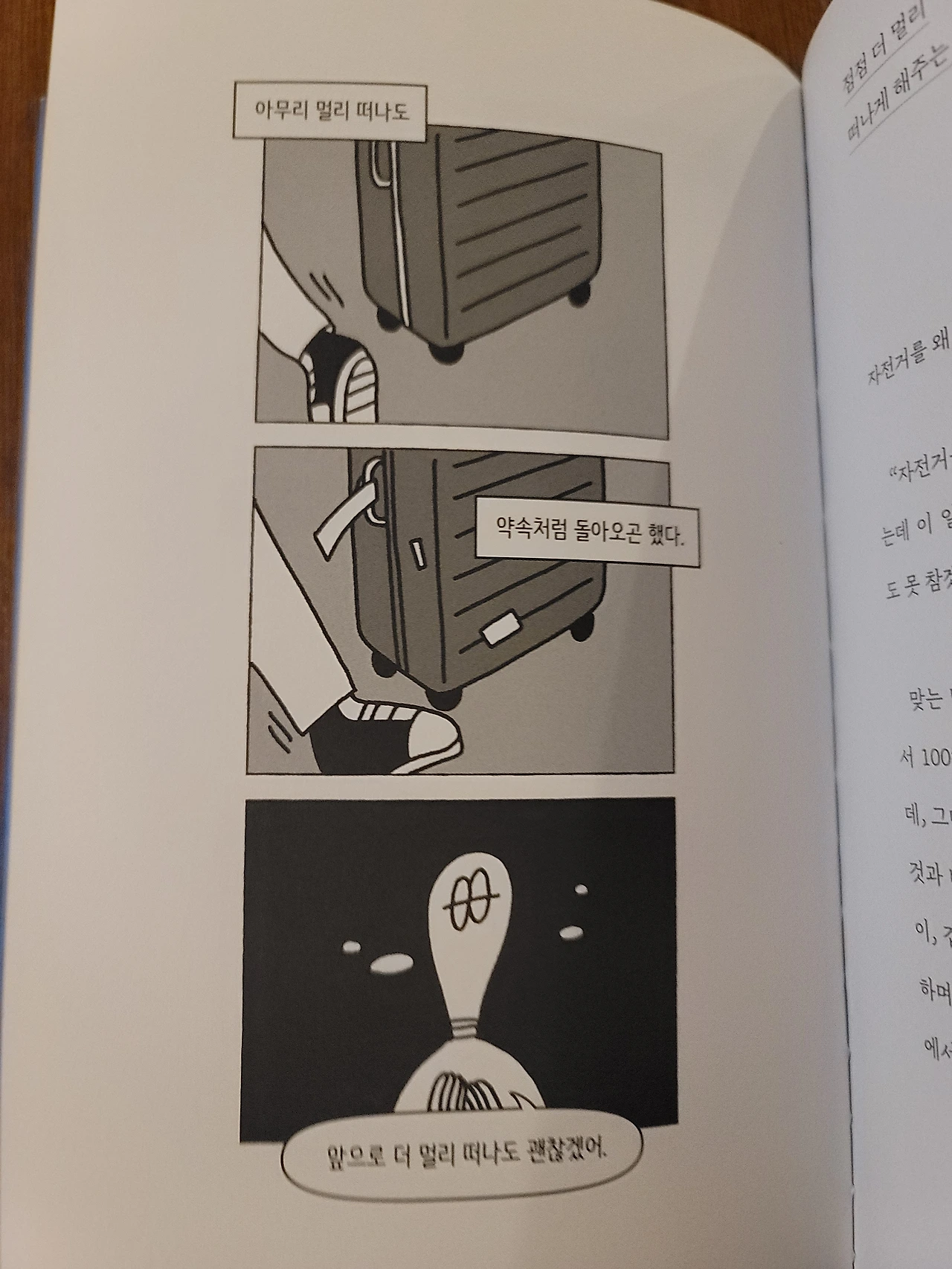 제자리걸음 같지만 결국 그녀는 나아가고 있고, 멈추지 않는 한 삶은 다른 풍경과 장면을 선물처럼 가져다준다. 나도 그녀의 응원에 힘입어, 오늘 이 한걸음을 디디며 흐뭇하고 행복해졌다. 보이지 않는 미래를 먼저 가보며 미래의 자신과 오늘의 자신이 일기장에서 나누는 대화는 더 아름다웠고 뭉클했다. 나도 그렇게 글을 쓰면서 미래의 나에게 오늘의 내가 위로를 받는다.