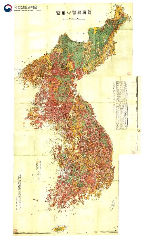 아래 지도는 1910년 조선총독부에 의하여 제작된 <조선임야분포도>이다. 일제강점기로의 전환이 이루어지는 시점에 제작되어서 조선후기를 막 지난 한반도의 산림분포를 파악할 수 있는데, 지도에서 초록색으로 표시된 부분이 벌채가 가능할 정도로 성장한 숲으로 전체의 약 30% 정도에 불과하다. 다시 말해, 노란색과 빨간색으로 표시된 나머지 70%가량은 헐벗었거나 어린나무가 자라고 있어 사용이 불가능한 상태였다는 것이다.