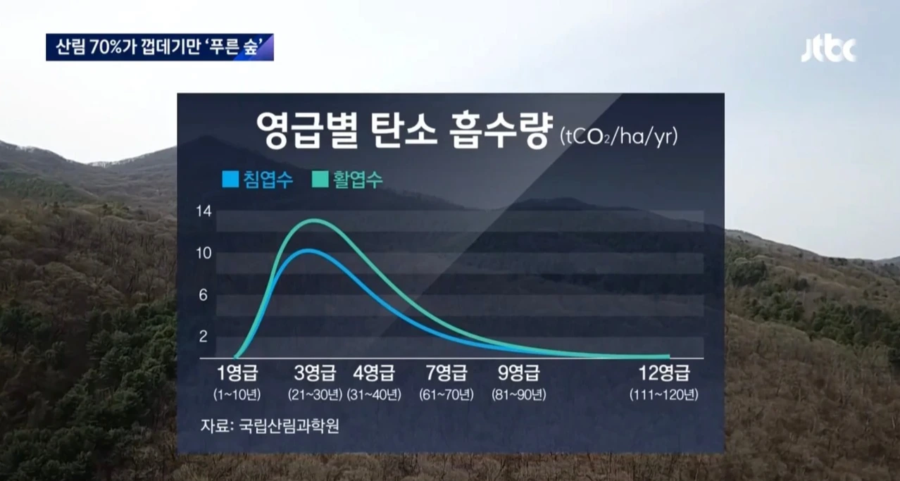 문제가 없지는 않다. 건강하고 지속가능한 숲은 아기나무, 청년나무, 장년나무, 노령나무가 함께 공존하는 숲이다. 하지만, 우리나라의 경우 나무들이 비슷한 시기에 심어져서 동시에 나이가 들었다. 탄소를 흡수하여 공기 정화를 하는 나무의 역할은 청년기에 정점을 찍고, 중장년기를 거치며 서서히 쇠퇴한다. 그런데 우리나라 나무의 70% 가량이 이미 중장년기에 해당하는 4영급에 해당한다. 그 말인 즉 겉으로는 푸른 숲이지만, 대다수의 숲이 공기를 정화하는 기능이 쇠퇴하여 온전한 푸른 숲의 기능을 온전히 수행하지는 못한다는 것이다.