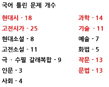 보면 문학에서는 고전시가, 현대시 / 현대 비문학에서는 과학, 기술 / 그리고 작문, 문법이 취약함을 알 수 있다.