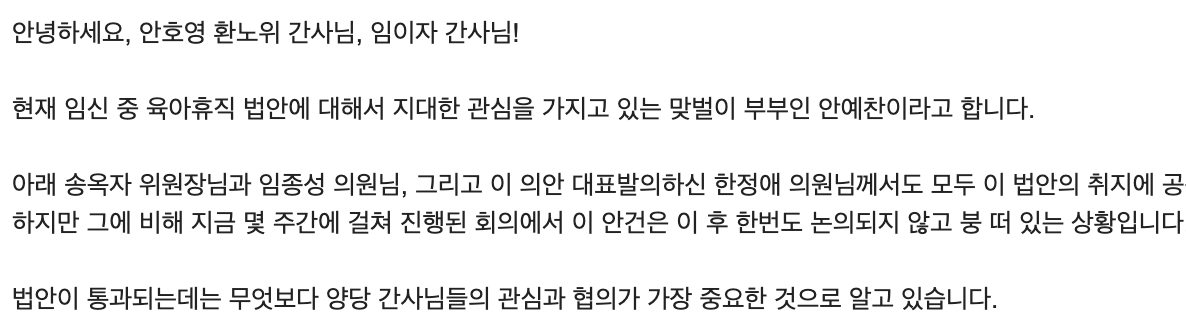 그래서 잊지 마시라고 이번에는 송옥주 위원장님과 더민주와 국민의힘 양당 환노위 간사분들께도 또 메일을 썼다. 잊지 말고 챙겨봐달라고 말이다.