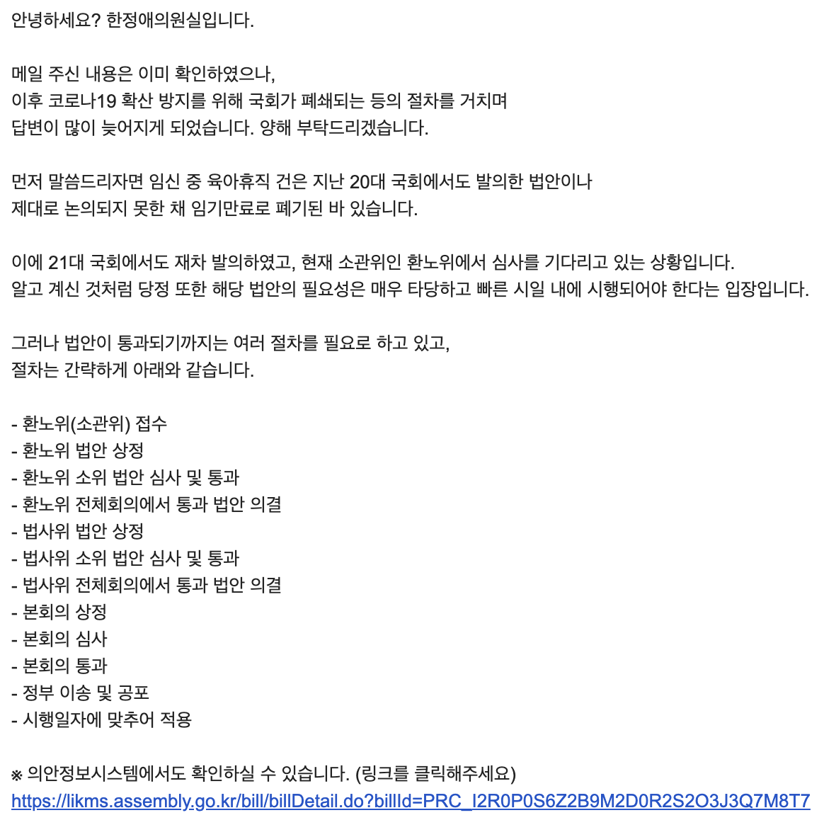 그리고 임신 중 육아휴직에 관련된 의안은 노동법과 관련이 있어서 현재 '환경노동위원회'에 의안이 상정이 되어 있으나 아직 논의가 되고 있다고 설명을 해주셨다. 현재는 한정애 의원님은 보건복지위원회 위원장을 맡게 되셔서 아무래도 환노위의 위원장인 송옥주 의원실에 연락을 해보면 좋겠다는 얘기도 해주셨다. 아래는 한정애 의원실에서 답변 주신 내용 캡쳐이다.