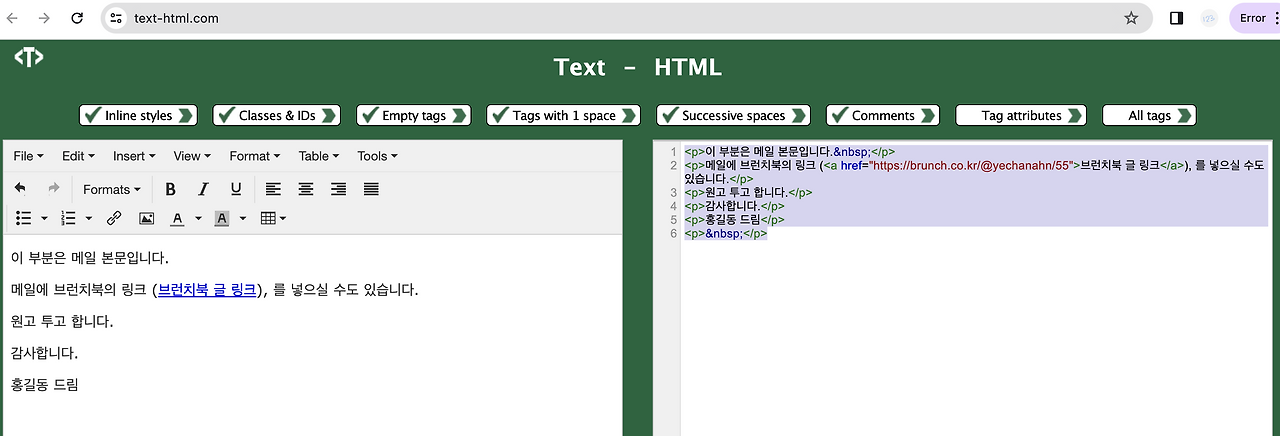 HTML 코드로 작성하는 것은 나도 못하는 일이다. 대신 우리를 위해 우리가 보통 Gmail 등을 쓸 때의 메일편집기와 비슷한 HTML 편집기로 쓰면 HTML코드로 변환시켜 주는 웹서비스가 있어 여기 가서 메일 본문을 작성 후 HTML 코드를 복사하여 붙여넣기 하면 된다.