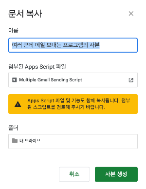 3) 아래와 같이 뜨면 이름을 원하는 대로 변경하고 사본 생성을 누르면 사본이 만들어진다. Apps Script라는 것이 실제 메일을 자동으로 보낼 수 있는 프로그램 코드이니 경고는 무시해도 된다.