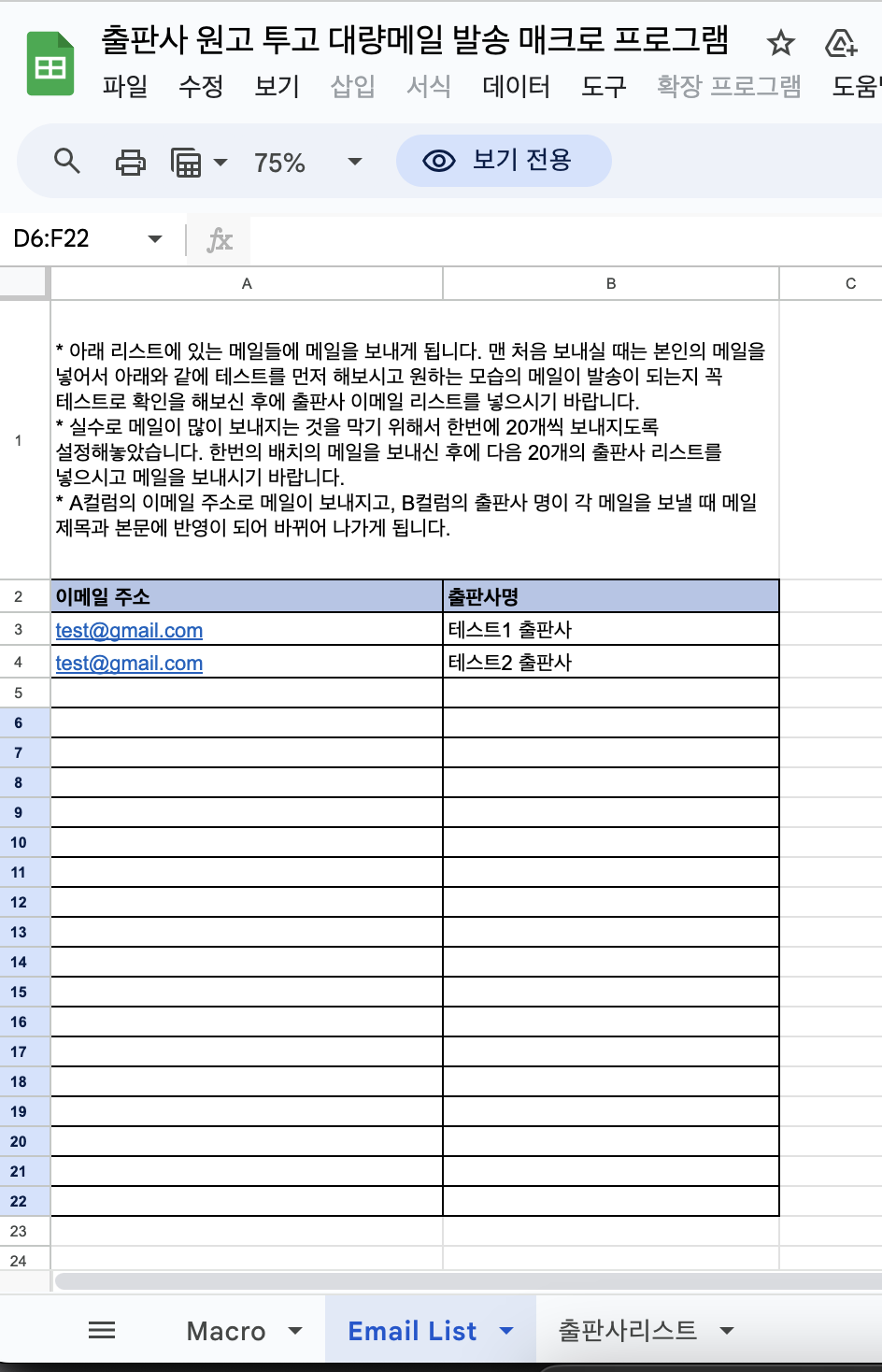3. Email List 탭에서 출판사 메일 리스트 작성하기