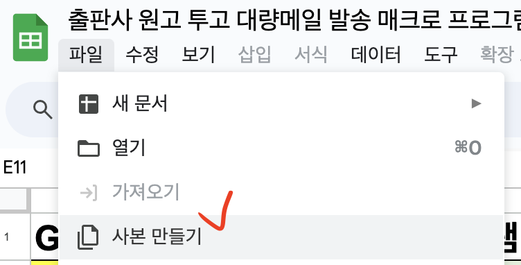2) 처음 링크에 들어가면 (아마도 구글 계정에 접속을 해야 할 것이다.) 스프레드시트가 뜨며, 사본 저장을 하여 본인의 구글드라이브에 똑같은 스프레드시트를 저장한다.