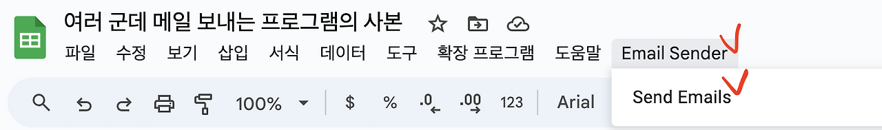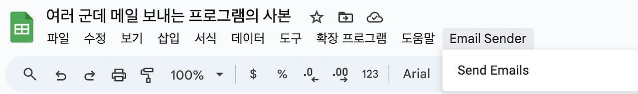 4) 아래와 같이 사본 파일이 만들어지게 되고 전체가 로드가 되면 위의 메뉴에 Email Sender 메뉴가 생기게 된다. 최초 사용등록을 해야만 매크로 사용이 가능하기 때문에 일단 Send Emails항목을 클릭한다.