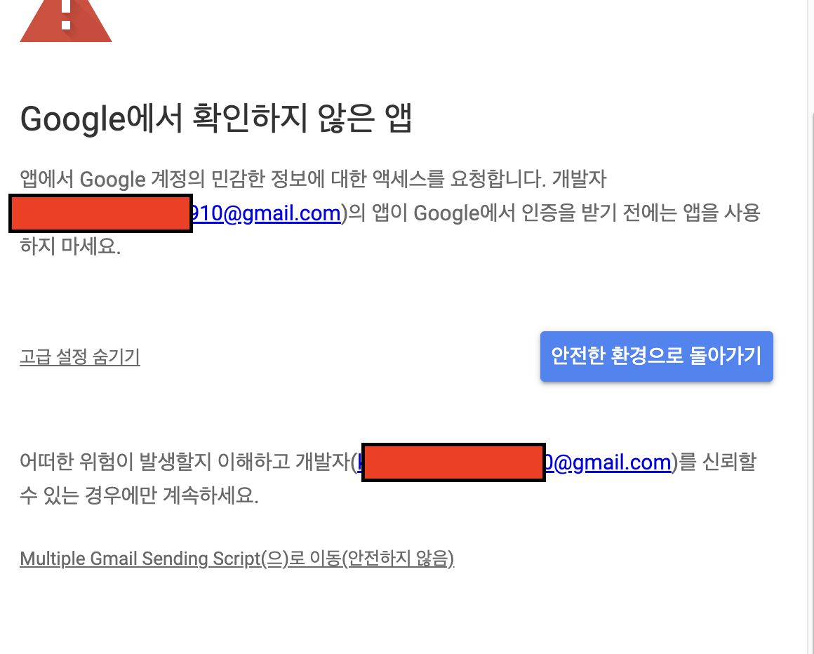 8) 고급을 누르면 아래와 같이 Multiple Gmail Sending Script(으)로 이동(안전하지 않음) 이 뜨게 되며 이를 클릭한다.