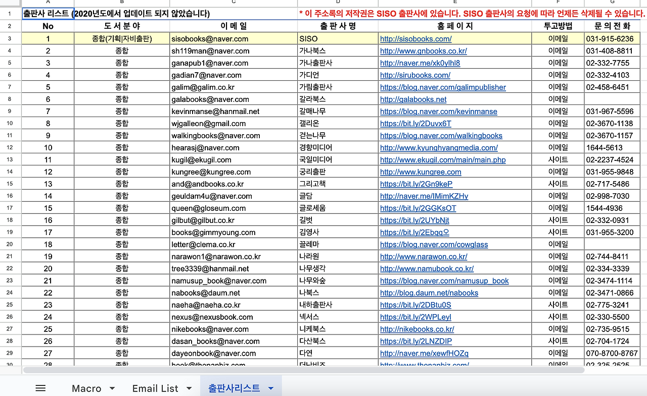마지막 탭인 출판사리스트 탭에는 내가 SISO 출판사에서 받았던 출판사 리스트가 있다. 2020년도에 받은 리스트라 최신 데이터가 아닌 부분은 미리 참고하여 사용해 주시면 되겠다. 메일을 통해서 공유 허락을 맡기 위해 출판사 측에 연락을 취했지만 아직 답변을 받지 못해 출판사에서 조건 없이 공유받았던 리스트를 역시나 조건 없이 공유한다. 다만 앞에서도 얘기했듯이 SISO출판사에서 만든 리스트이기 때문에 언제든 SISO 출판사에서 원하지 않으면 이 리스트는 삭제될 수 있다는 점 재차 강조한다.