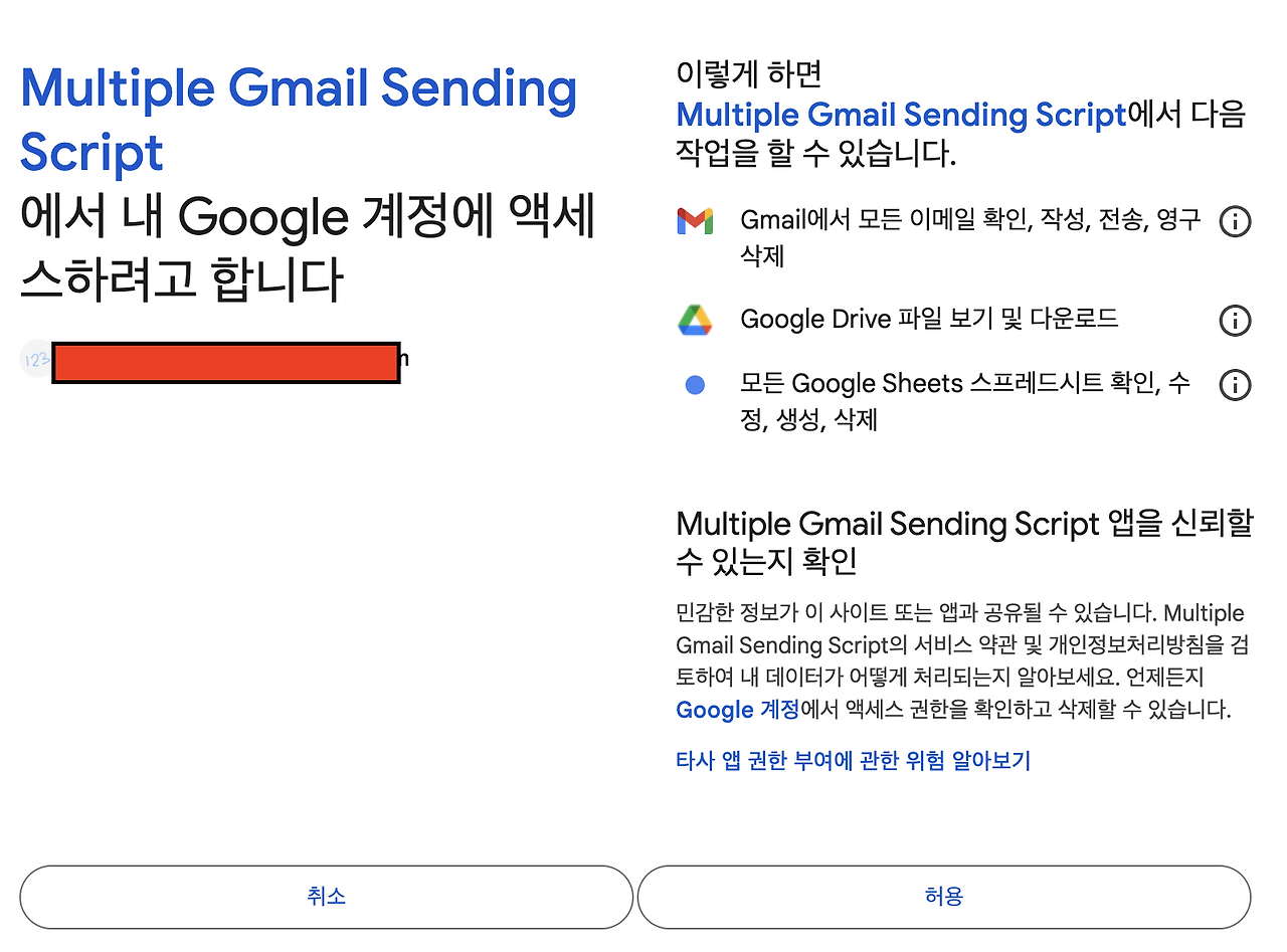 7) 맨 처음 이 항목을 클릭하게 되면 메일을 보내는 App Script (실제 메일 보내는 프로그램 코드)를 사용 등록하는 절차를 거치게 된다. 구글 계정 로그인을 하면 앱을 사용하겠냐는 경고창이 뜨고, 고급을 눌러 진행하게 되면 이 프로그램이 내 메일 계정으로 메일을 보낼 수 있도록 권한을 주게 된다. 확인을 누르면 사용 등록이 완료된다.