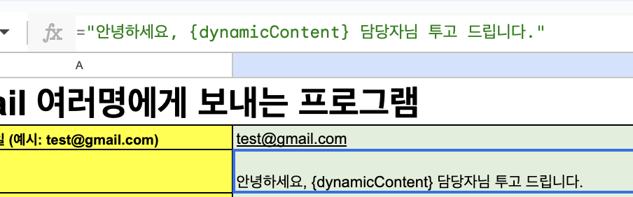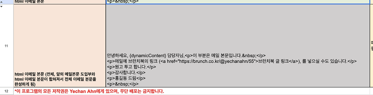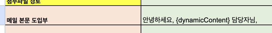 3) 메일 제목은 세 번째 행에 넣는다. C열에 설명이 있다. 입력창에서 바꾸고 싶은 부분은 바꾸되 메일에 출판사 명을 넣고 싶다면 {dynamicContent} 부분 외의 부분을 수정한다. 큰따옴표 안에서 변경해야 하며 {dynamicContent} 부분이 출판사 명으로 바뀌어 메일이 보내지게 된다.