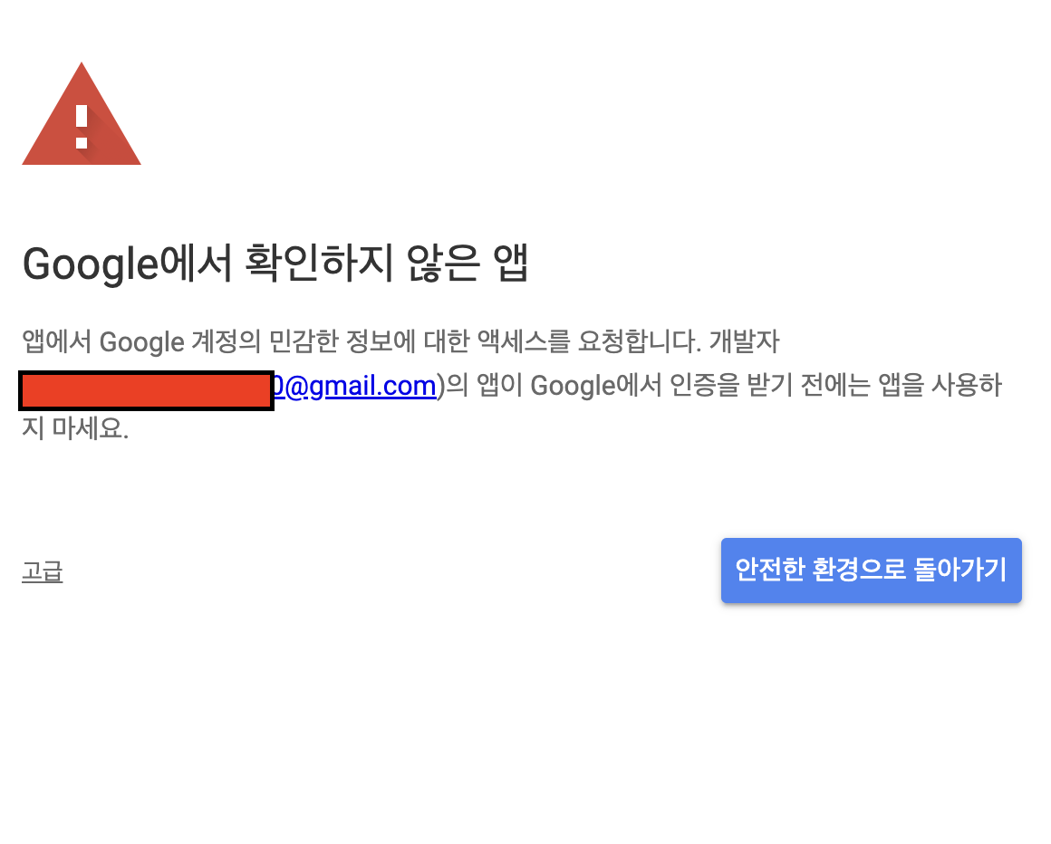 7) 그러면 아래와 같은 경고창이 뜬다. 이 경고창은 매크로 프로그램 사본을 받을 때 App Scripts가 같이 다운로드 되어지면서 본인 계정에 새롭게 생긴 프로그램이라 아직 인증이 되지 않았기 때문에 뜨는 경고로 사용하고자 하면 아래 좌측 하단의 고급 을 누른다.