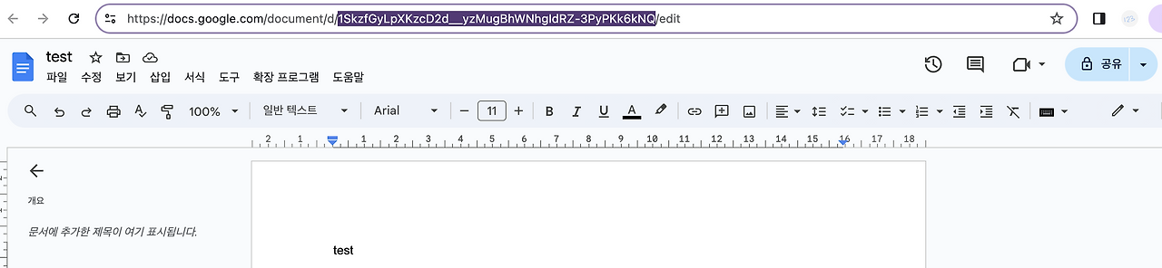 구글드라이브의 파일 ID는 구글드라이브에 업로드한 파일을 열었을 때의 URL 주소에서 추출할 수 있다. 예를 들면 아래 구글 문서 파일의 스크린샷과 같이 d/ 와 /edit 사이에서 확인이 가능하다. 이 부분을 복붙 하여 4번째 행에 넣으면 관련 파일이 PDF형식으로 변경되어 메일에 첨부가 되어 나가게 된다. 파일을 첨부하게 되면 메일 보낼 때 걸리는 시간이 좀 더 많이 소요되게 되는 점 참고 바란다.