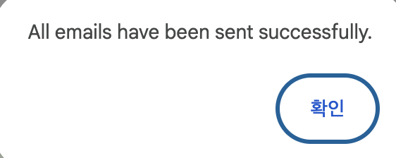 다 발송이 되면 아래와 같이 몇 개의 메일이 발송되었는지 메일 발송이 완료되었다는 팝업이 뜨게 되고 확인을 누르면 매크로 실행이 완료된다.