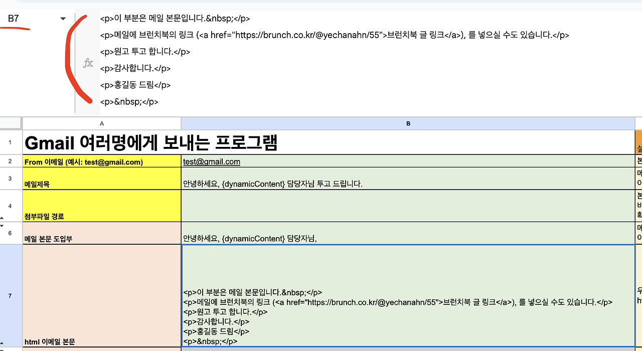 아래에 B7 셀 '값 입력창'에 가서 붙여 넣기를 해야만 전체 HTML 코드가 이 하나의 셀에 들어간다. 만약 그냥 B7셀만 클릭하고 붙여 넣기를 하면 아래 셀로 쭉 HTML 코드가 여러 셀로 나눠져서 붙여 넣기가 되기 때문이다. 이 부분을 꼭 주의하도록 하자. 아래 스크린샷은 이해를 돕기 위해 기존 값입력창의 너비를 늘린 상태인 점 참고 바란다.