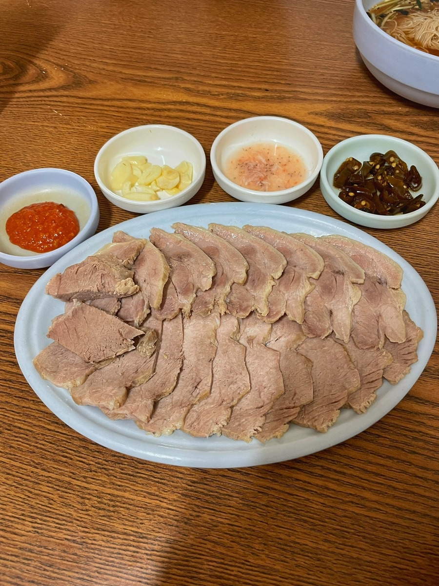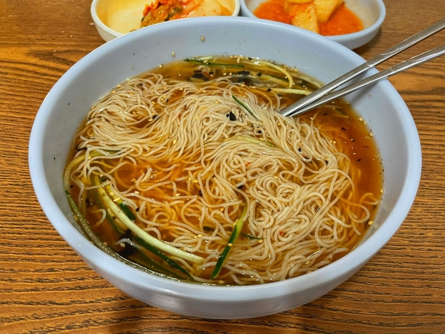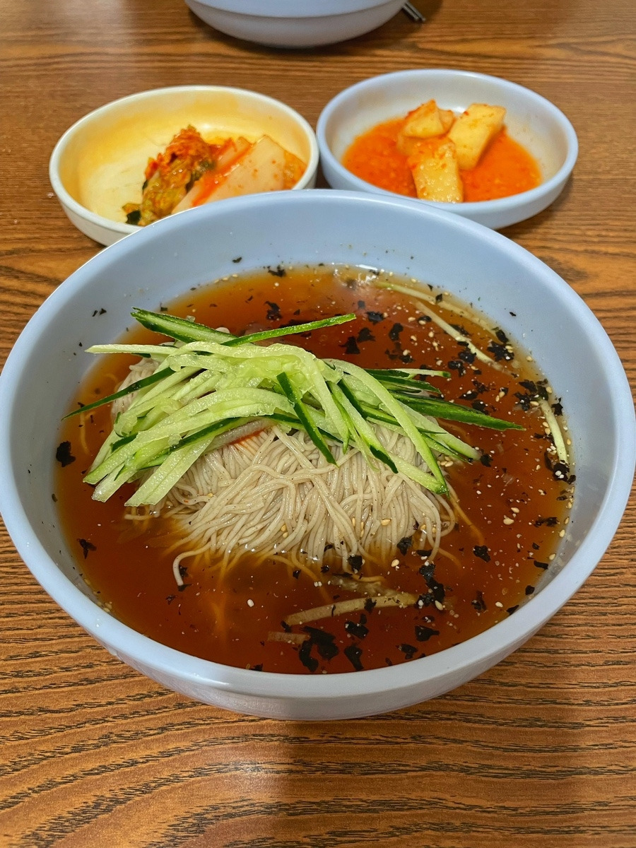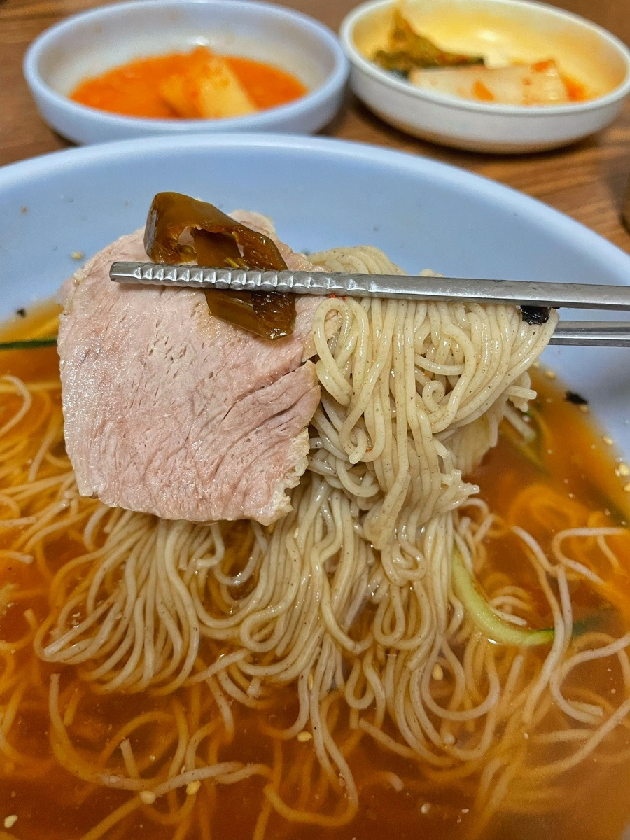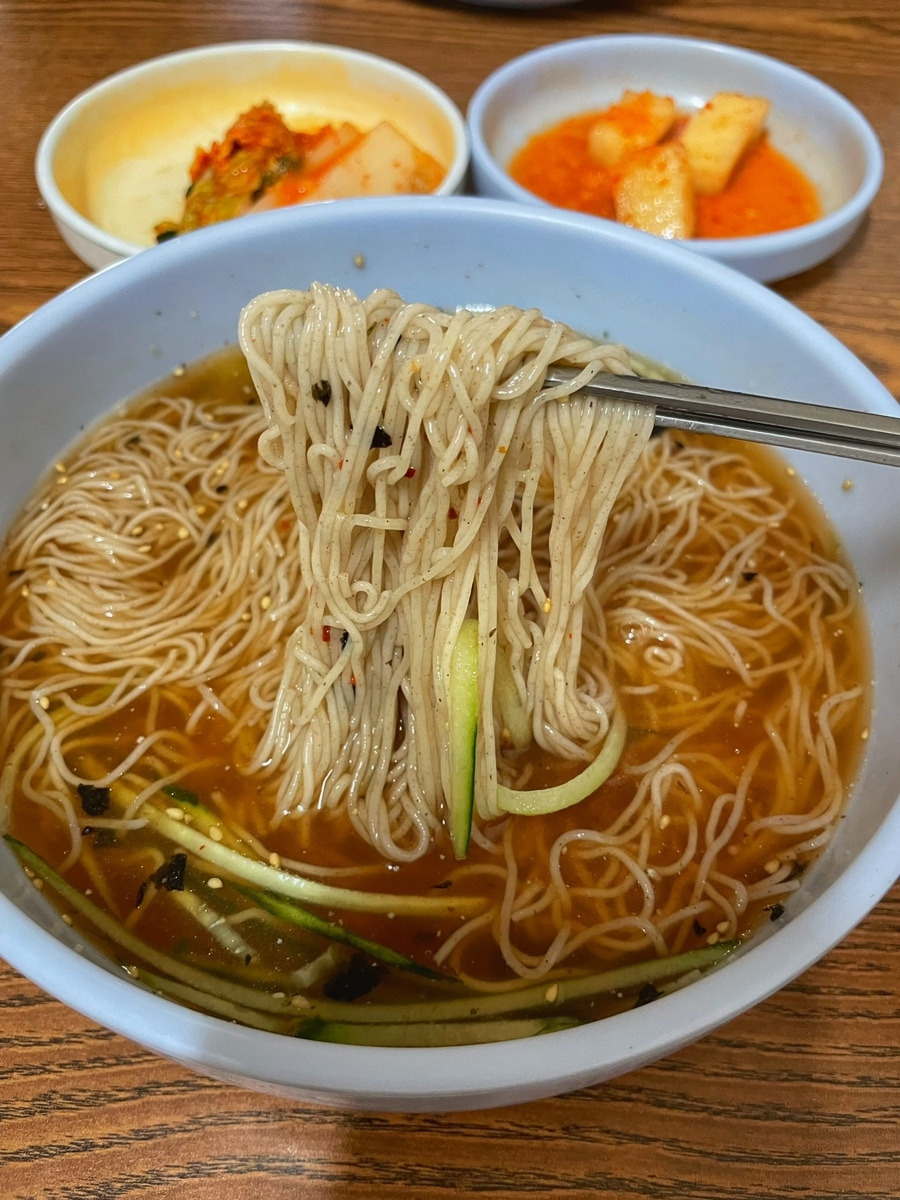 메뉴는 단 두 개, 메밀막국수와 편육이다. 보통은 두 가지 메뉴를 함께 주문하여 먹는다. 추운 겨울이지만 따뜻한 바닥에 앉아있으니 추위가 저절로 잊혔다. 음식은 주문한 지 얼마 지나지 않아 곧바로 나왔다. 막국수는 평소에 알던 비주얼이 아니었다. 오이고명이 가득 올라가 있고 김가루가 조금 뿌려져 있다. 면발은 냉모밀과 냉면이 합쳐진 듯한 모습이랄까? 약간은 생소한 모습이다. 뜨끈한 온돌방에서 먹는 시원한 막국수라니 전두엽이 짜릿했다. 본격적으로 메밀면을 풀어주고 맛보니 면은 담백한데 육수에서는 시큼한 식초맛이 나는 게 특이했는데, 따끈따끈한 편육을 함께 싸 먹으니 그 진가가 돋보였다. 촉촉하고 부드러운 편육은 잡내 하나 없이 깔끔하여 막국수와 잘 어우러졌다. 특별한 막국수와 수육을 먹고 싶다면 꼭 한 번쯤 들러볼 만한 곳이다. 여행지에서 만나는 그곳만의 맛은 언제나 새롭고 즐겁다. 나에게 여행은 멋.. 아니, 사실 맛이다 : )