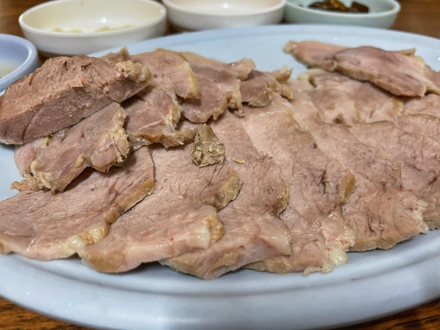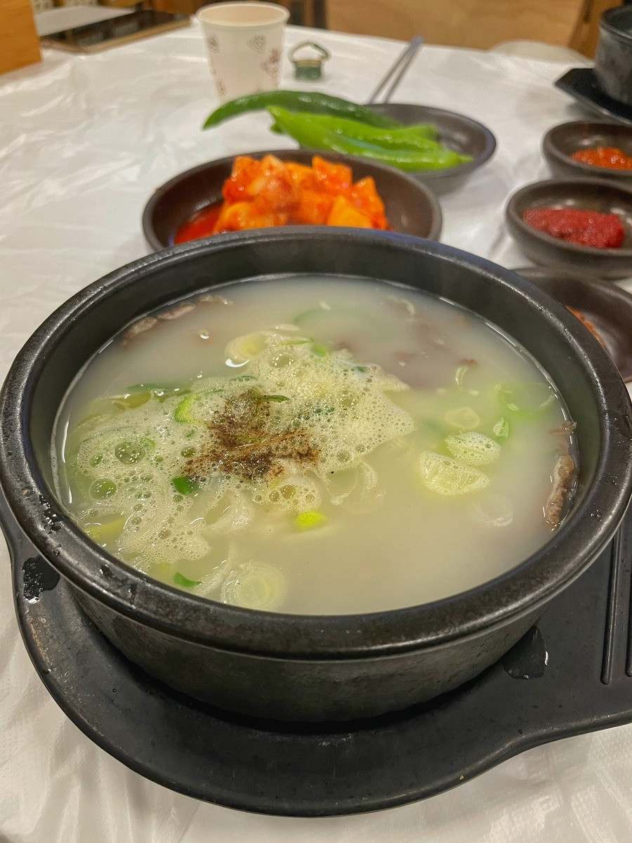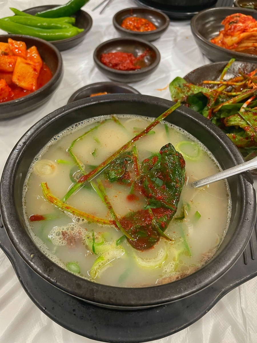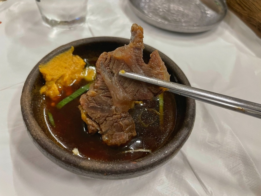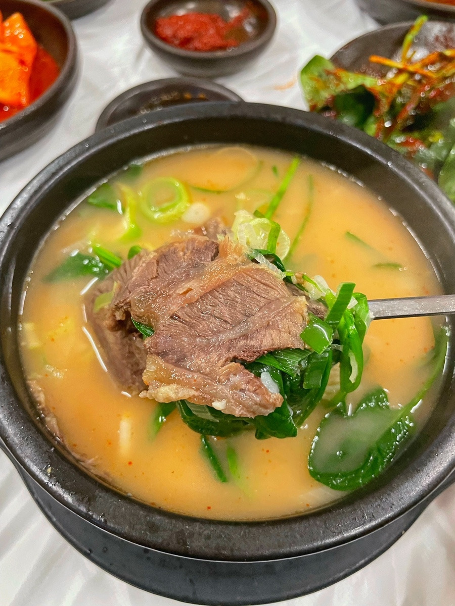 꼬리곰탕, 도가니탕, 양탕, 곰탕의 메뉴가 있었는데 가장 기본적인 곰탕을 주문했다. (물론 소주도 1병 추가요.) 수육 종류도 꼬리수육, 도가니수육, 양수육, 일반수육으로 다양했다. 뽀얀 육수의 곰탕이 나오면 소금으로 밑간을 한 뒤 취향에 맞게 다진 양념과 시금치를 넣어 먹으면 된다. 시금치에 양념이 되어 있어서 이걸 넣어 먹으면 국물이 빨갛게 변하여 어느 정도 매콤한 맛도 살아난다. 담백하고 뜨끈한 육수를 계속 마시다 보니 추웠던 몸이 어느새 사르르 녹았다. 반찬 중에는 고기전용소스 이외에도 갈치속젓이 있어서 야들야들한 고기를 더 감칠맛 있게 즐길 수 있다.