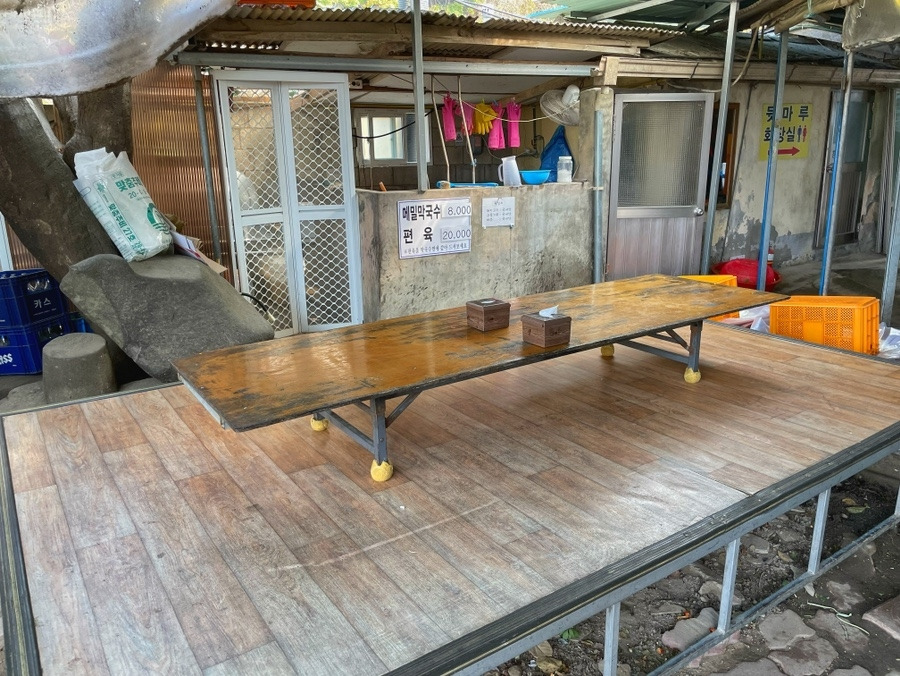 부여 여행의 끝은 바로 장원막국수, 약 30년 동안 한 자리에서 사랑받고 있는 부여의 대표 막국수집이다. 오래전부터 이곳을 찾았다던 어느 블로거의 글을 본 적이 있다. 봄, 여름, 가을, 겨울 사계절의 외관을 전부 찍어놓아 단골임을 인증했는데, 이전에 느낀 맛이 한결같기에 계절이 여러 번 변해도 찾아오는 것이 아닐까 싶었다. 기대를 안고 오전 일찍 장원막국수를 찾았다. 세월의 흔적이 느껴지는 집 같은 식당의 모습 그리고 야외 큰 평상을 보니 왠지 오래된 할머니네에 놀러 온 기분이었다.