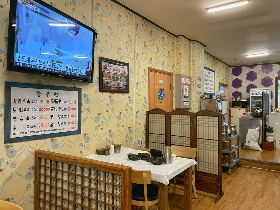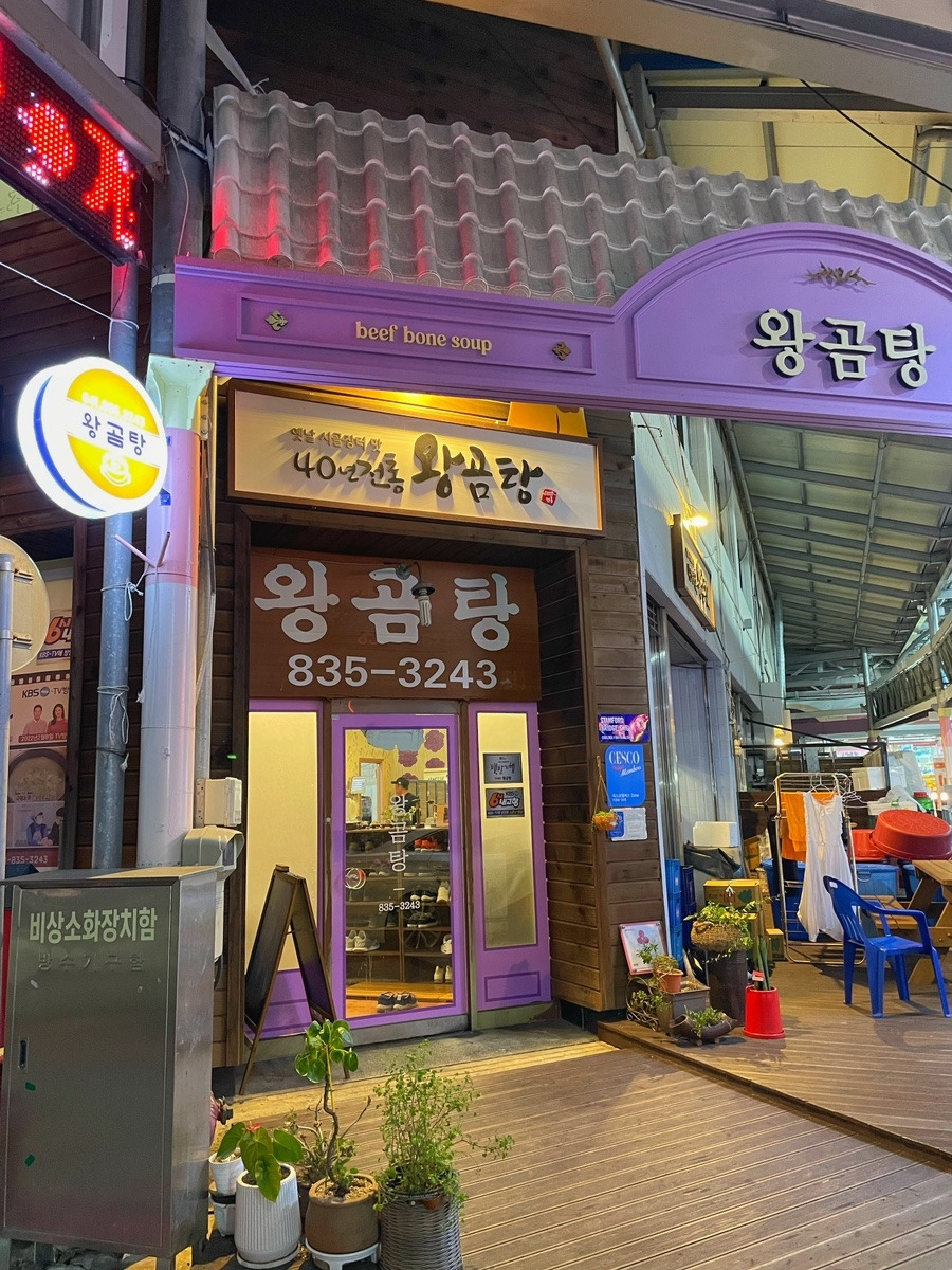 저녁 6시밖에 안 되었지만 부여 시내는 어두컴컴하다. 보통 점심장사만 하고 문을 닫는 곳이 많아서, 번화가의 술집 말고는 저녁을 먹을만한 식당이 별로 없다. 머물던 숙소 주인이 남기고 간 쪽지 속 쓰여있던 이곳 왕곰탕식당을 검색해 보니 고맙게도 오후 8시 30분까지 영업 중이었다. 시금치를 넣어 먹는 특별한 곰탕이 있는 곳이라 하여 지체 없이 찾아갔다. 어두운 시장 안에 왕곰탕식당의 간판만 환하게 불을 밝히고 있다. 내부에는 술을 한잔 곁들이는 아저씨들, 외식 중인 가족들, 포장하러 온 손님으로 북적였다.