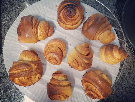 우여곡절 끝에 시나몬롤 망... 꽃 모양은 역시나 타버렸고 (설탕과 시나몬 파우더가 묻어나는 부분이 위로 향해서 오븐의 상하 온도차 때문에 그런 듯하다.) 나머지도 살짝씩 탄기가 있다. 시나몬 파우더가 새어 나오지 않도록 더 꼼꼼히 돌돌 말아야 했음을. (또르르) 실패했지만 웃어야지. 엄마는 실수왕인데 도전도 잘한다고 은근히 흘려야지. (안 듣고 있니?) 그러거나 말거나, 아이들은 너무 맛있다고 한다. 탄 부분은 뜯어내 버리고, 예쁜 건 새꾸들 꺼 !